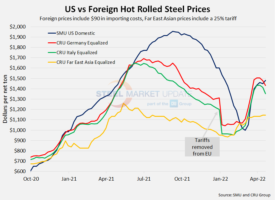 CRU published Italian HRC prices at $1,264 per net ton ($1,393 per metric ton), down $59 per ton from last week and down $32 per ton from one month ago. After adding import costs, the delivered price of Italian HRC is approximately $1,354 per ton. Accordingly, domestic HRC is now theoretically $126 per ton more expensive than imported Italian HRC, compared to $37 per ton one week prior and $26 per ton two weeks ago. This is the fifth consecutive week foreign steel prices have held this price advantage. We briefly saw the opposite in the first half of March, when imported Italian HRC offered a theoretical savings of $4-98 per ton. Prior to removal of the 25% Section 232 tariff, the November 2021 spread of $577 per ton was the largest seen in SMU’s data history.