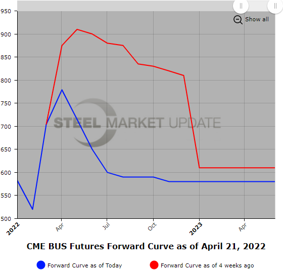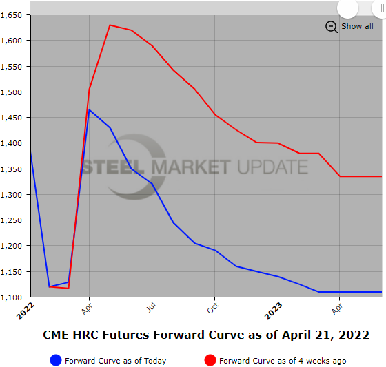 Recent HR spot price increases have continued to decelerate this month as prices near $1,500/ton. Initial market metallic supply concerns related to the impact of the Ukraine/Russia war appear to have abated as better market intelligence is reflected in the HR curve. Month-to-date April, the futures curve prices have steepened and shifted considerably lower even as the spot price rose. The backwardation in the Apr’22 to Dec’22 HR futures has widened by $92/ST (1575/1317 versus 1465/1150) for the period of Apr 1st as compared to Apr 21st. The price shift lower in the HR forward curve from May’22 HR future through Dec’22 HR future represents an average of almost (-$175/ST). Some of this decline reflects some perceived future headwinds: How fast will the Federal Reserve Bank have to increase rates due to the stubbornly high inflation? How much will this dampen future HR demand?