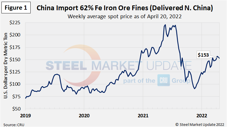 After rising to record levels last summer, the Chinese import price of 62% Fe content iron ore fines declined through November, reaching an 18-month low. Prices have since risen and continue to trek upward; Figure 1 shows the price of 62% Fe delivered North China at $153 per dry metric ton as of April 20, levels last seen in August 2021. Iron ore prices have increased 3% in the last 30 days, up 22% compared to three months ago, yet down 14% from the price this time last year.