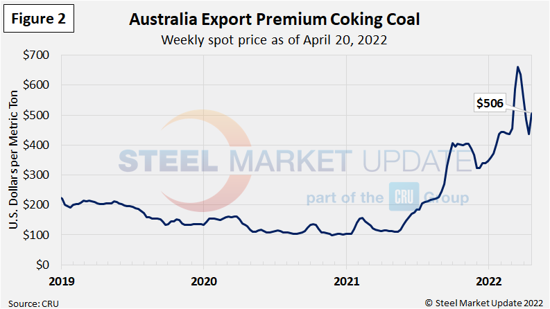 The price of premium hard coking coal FOB east coast of Australia surged in March to a record high of $660 per dry metric ton, with the latest figure down 23% from that high to $506 per ton (Figure 2). Prices have increased 26% compared to three months prior and are up 347% from prices one year ago. In 2021, coking coal prices reached a record-high of $405 per ton in October/November. Prior to that, the average coking coal price in 2019-2020 was $151 per ton, and the previous record for coking coal prices was $400 per ton in July 2008.