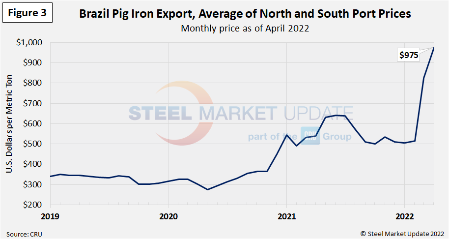 Most of the pig iron imported to the US had come from Russia, Ukraine and Brazil. This report summarizes prices out of Brazil and averages the FOB value from the north and south ports. Pig iron prices had been elevated but relatively stable for most of 2021 and early 2022. Prices jumped 60% in March following the invasion of Ukraine by Russian forces – which limited or halted supplies from both nations. And prices increased another 18% this month. The average pig iron price for April is now $975 per metric ton, a new record high. Recall that pig iron prices had reached a multi-year low of $275 per metric ton in May 2020 (Figure 3).
