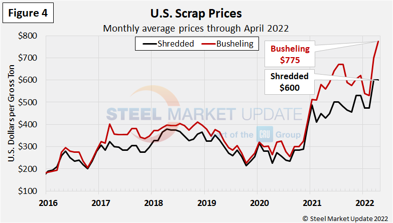 Scrap prices remained at or exceeded record levels in April; shredded scrap prices were flat over March at $600 per gross ton, while busheling scrap prices increased 11% to $775 per ton. Prior to 2021, the previous record for scrap prices over the last decade was $510 per ton for busheling in December 2011 and $473 per ton for shredded in March 2012. Scrap expert sources expect prices to remain steady or ease next month.