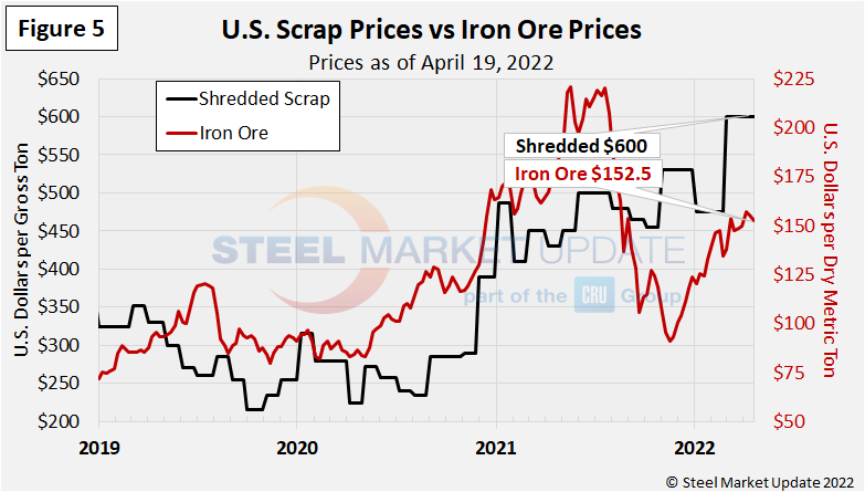 Figure 5 shows the prices of mill raw materials over the past four years. Iron ore prices are 31% below the May 2021 peak of $221 per dry metric ton, while shredded scrap prices have risen 40% in that same time.
