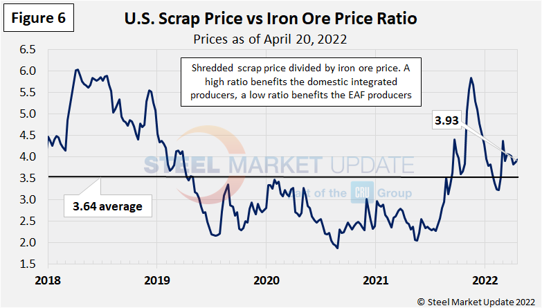 To compare the two, Steel Market Update divides the shredded scrap price by the iron ore price to calculate a ratio (Figure 6). A high ratio favors the integrated/BF producers, a lower ratio favors the minimill/EAF producers. At the current 3.93 ratio shown below, the cost advantage briefly held by integrated producers in late 2021 has returned. Five months ago we saw a ratio of 5.84, the highest seen since mid-2018. The scrap to iron ore ratio reached a record low of 1.86 in August 2020 (within SMU’s limited 12-year data history).