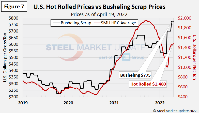 Figure 7 shows how the price of hot rolled steel generally tracks with the price of busheling scrap. Bush rose $75 per gross ton over the past month, up $245 per ton from February, and up $215 per ton from one year ago. The SMU hot rolled price average increased $30 per ton week over week to $1,480 per ton. This is an increase of $80 per ton compared to four weeks prior, up $480 per ton from the early-March low, and up $70 per ton from levels this time last year.