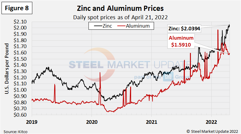 Zinc, used to make galvanized and other products, has rapidly increased in price since early March. The LME cash price was $2.04 per pound as of April 21, up 22% from three months prior and up 60% from the same time last year (Figure 8). The LME cash price for zinc surpassed $2 per pound on April 13, yet another historic record.