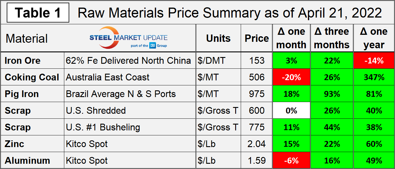 Following record price increases in March, prices for four of the seven of the steelmaking raw materials tracked in this SMU analysis increased over the last 30 days. Through late April, pig iron prices increased 18% compared to one month prior, zinc prices rose 15%, busheling scrap prices increased 11%, and iron ore prices were up 3%. In that same time frame, shredded scrap prices were unchanged, while aluminum prices declined 6% and coking coal prices fell by 20%.