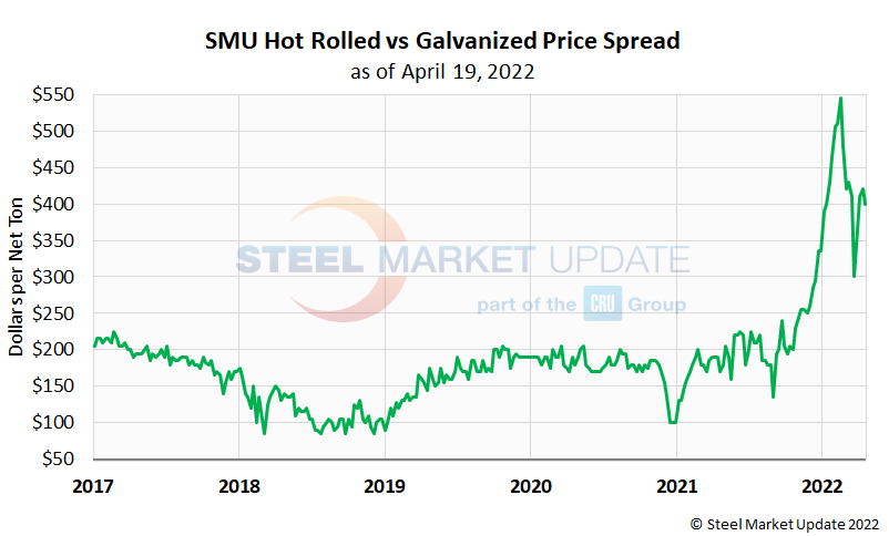 As shown in the graph below, galvanized held a premium between $80-220 per ton over hot rolled for the last few years, exceeding that range in late 2021. The premium rapidly rose to peak at $545 per ton in mid-February, marginally declining thereafter. The spread last week was $400 per ton, having dipped to a 3-month low of $300 per ton in late March.