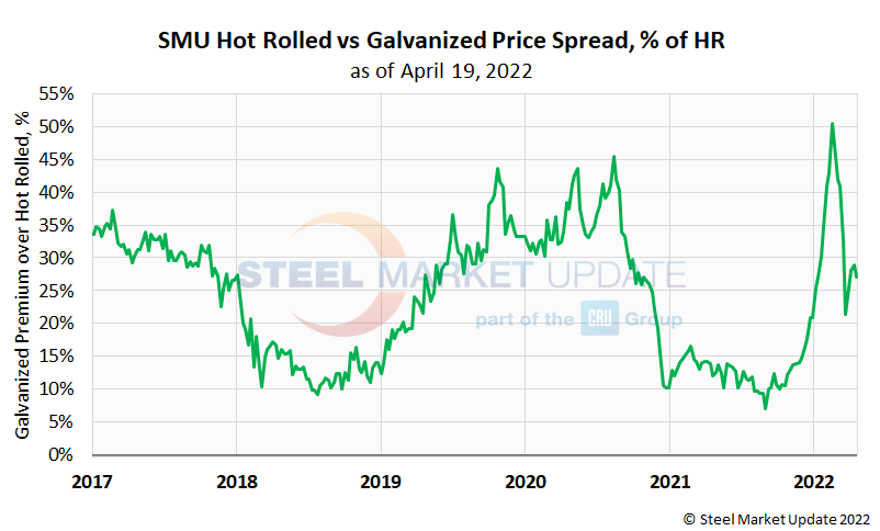 To better compare this price spread, we graphed the galvanized price premium over hot rolled as a percentage of the hot rolled price. This is an attempt to paint a clearer comparison against historical pricing data. As shown in the below graphic, the percentage premium is not as alarming compared to the dollar value premium. Galvanized prices held an average premium of 24% above hot rolled prices from 2017 through the end of 2021. 2021 averaged just 13%, while 2022 YTD now averages a 34% premium through last week. The premium rose to a record high in mid-February 2022 of 50%. The latest spread has softened to 27% and has been roughly in that ballpark for the last three weeks.