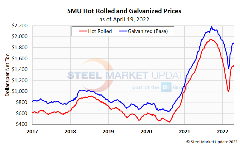 SMU’s hot rolled coil price averaged $1,480 per ton ($74 per cwt) last week and has risen six of the past seven weeks. Recall our index had reached a 14-month low of $1,000 per ton in the first week of March, following a record-high $1,955 per ton in September 2021. Our latest galvanized price index averaged $1,880 per ton ($94 per cwt) last week, and has remained steady or increased each of the past seven weeks. Galvanized prices peaked at $2,185 per ton last September, falling to a 12-month low of $1,420 in early March.