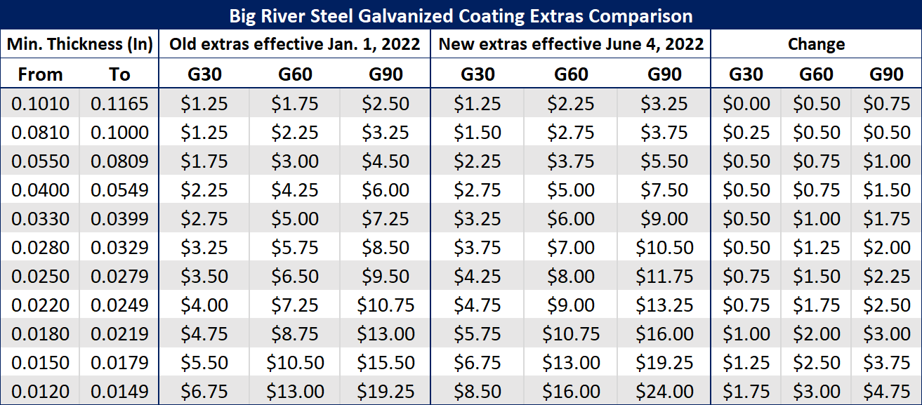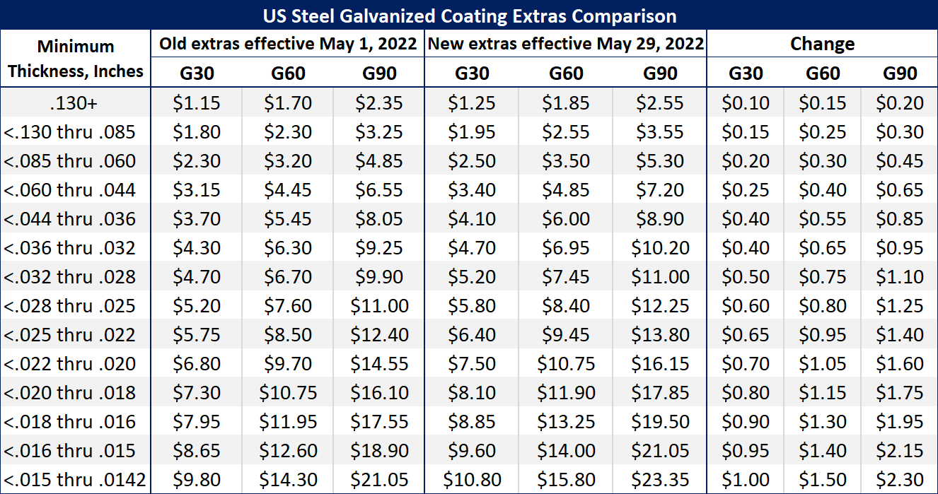 Earlier this week, US Steel and Big River Steel notified customers of an upward revision to their galvanized steel coating extras. New USS extras are effective May 29, 2022, while BRS extras are effective June 4, 2022.