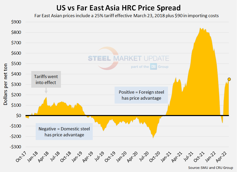 As of Wednesday, April 27, the CRU Far East Asian HRC price declined $37 per ton from the previous week to $807 per net ton ($890 per metric ton), down $27 per ton from one month prior. Adding a 25% tariff and $90 per ton in estimated import costs, the delivered price of Far East Asian HRC to the US is $1,099 per ton. The latest SMU HRC price average is $1,450 per ton, down $30 compared to one week prior, but up $15 per ton from one month ago. Therefore, US-produced HRC is now theoretically $351 per ton more expensive than imported Far East Asian HRC. That differential was $335 per ton last week and $305 per ton two weeks prior. This is the seventh consecutive week foreign steel prices have held this price advantage. We briefly saw the opposite in February and March when domestic HRC was $28-72 per ton cheaper than Far East Asian prices. The largest price spread between these regions was $847 per ton in September 2021, when Far East Asian prices held a considerable advantage.