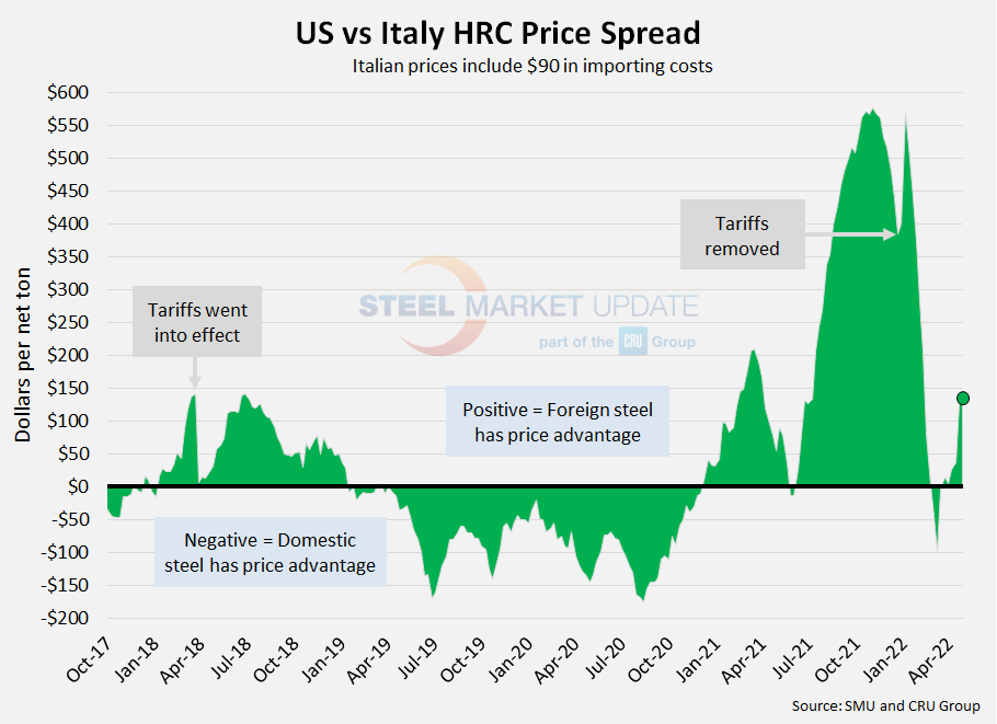 CRU published Italian HRC prices at $1,219 per net ton ($1,343 per metric ton), down $45 per ton from last week and down $121 per ton from one month ago. After adding import costs, the delivered price of Italian HRC is approximately $1,309 per ton. Accordingly, domestic HRC is now theoretically $141 per ton more expensive than imported Italian HRC, compared to $126 per ton one week prior and $37 per ton two weeks ago. This is the sixth consecutive week foreign steel prices have held this price advantage. We briefly saw the opposite in the first half of March, when imported Italian HRC offered a theoretical savings of $4-98 per ton. Prior to removal of the 25% Section 232 tariff, the November 2021 spread of $577 per ton was the largest seen in SMU’s data history.