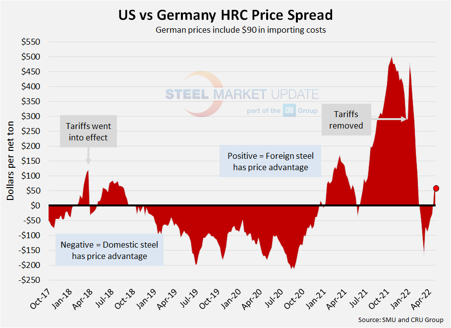 The latest CRU German HRC price is $1,300 per net ton ($1,433 per metric ton), down $43 per ton from last week and down $114 per ton from one month ago. After adding import costs, the delivered price of German HRC is approximately $1,390 per ton. Accordingly, domestic HRC is theoretically $60 per ton more expensive than imported German HRC, up from a spread of $47 last week. Prior to last week, we saw the opposite over the previous eight weeks, when domestic prices held the competitive advantage. Two weeks ago German prices were $27 per ton more expensive than domestic steel, and one month ago they were $70 per ton more expensive. Prior to removal of the 25% tariff, the October 2021 spread of $504 per ton was the largest seen in SMU’s data history.