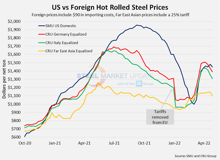 The following calculation is used by Steel Market Update to identify the theoretical spread between foreign HRC prices (delivered to US ports) and domestic HRC prices (FOB domestic mills). This is only a “theoretical” calculation because freight costs, trader margins, and other costs can fluctuate, ultimately influencing the true market spread. This compares the SMU US HRC weekly index to the CRU HRC weekly indices for Germany, Italy and Far East Asian ports.