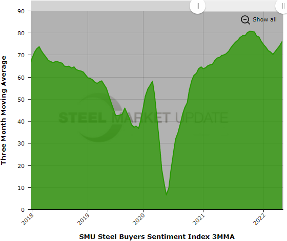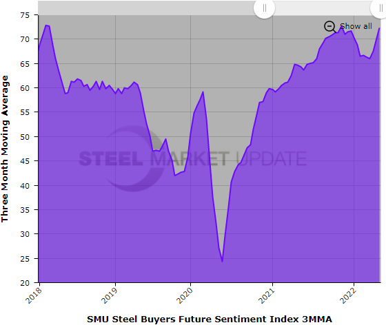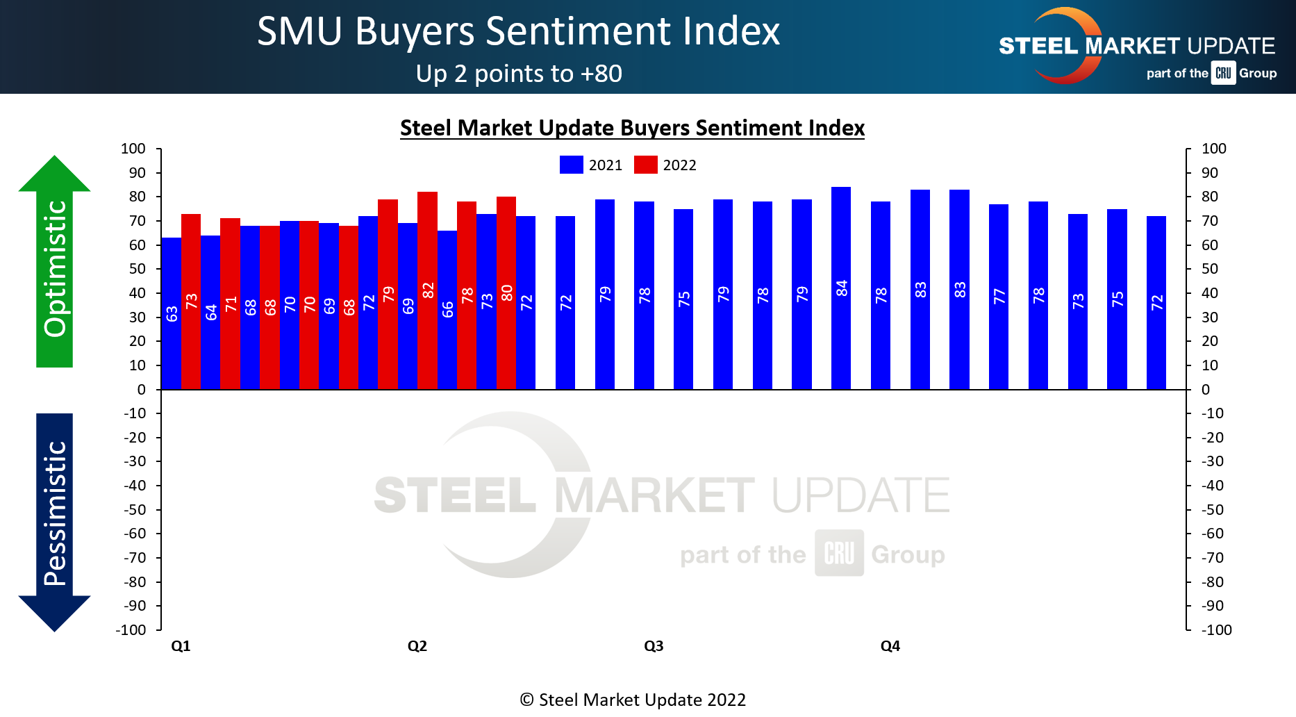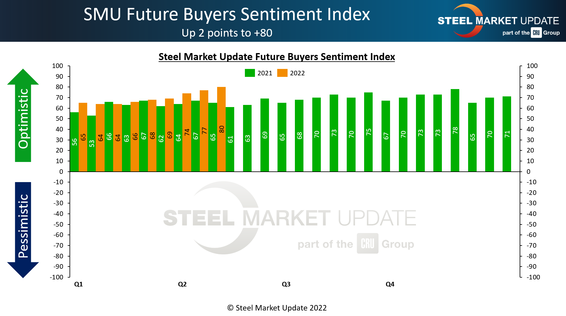 Steel Market Update’s Steel Buyers Sentiment Index rose 2 points last week, in line with the strong levels we’ve seen over the last six weeks. Our Future Sentiment Index rose to a new high, surpassing a prior record set in November 2021.
