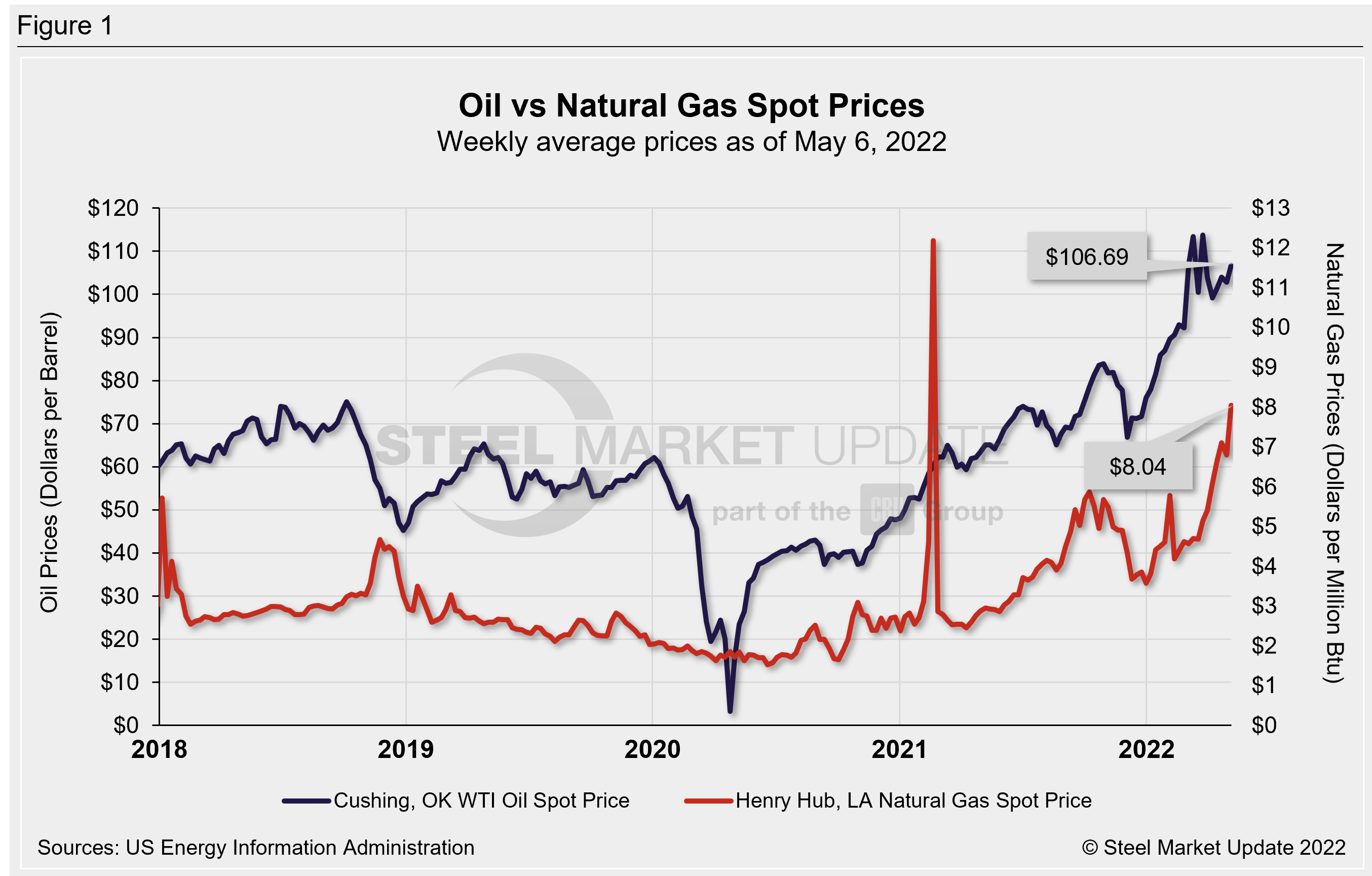 Natural gas prices eased through mid-March but are now surging upward again. The spot price as of May 6 was $8.04 per MMBTU (Million British Thermal Units), the highest level since Aug. 2008. (We are excluding high spot prices in Feb. 2021 resulting from winter storms and supply scarcity). EIA expects natural gas prices to average $7.83/MMBTU in the second quarter and $8.59/MMBTU for the full year in 2022.