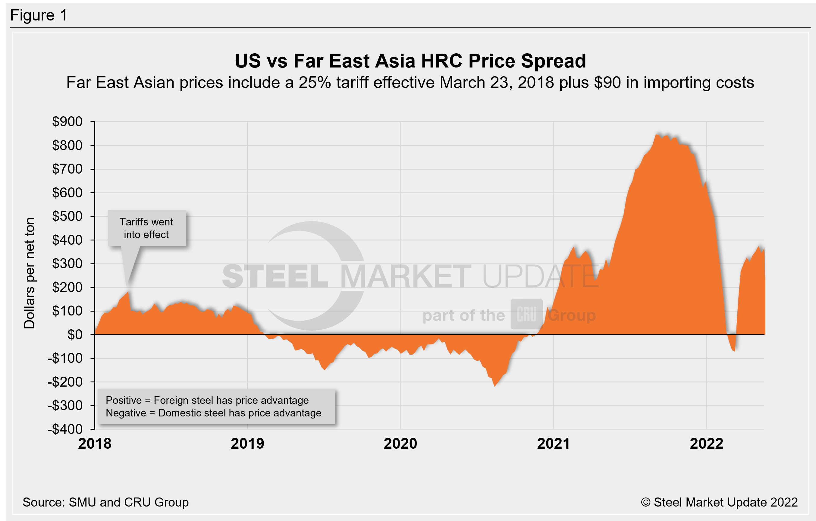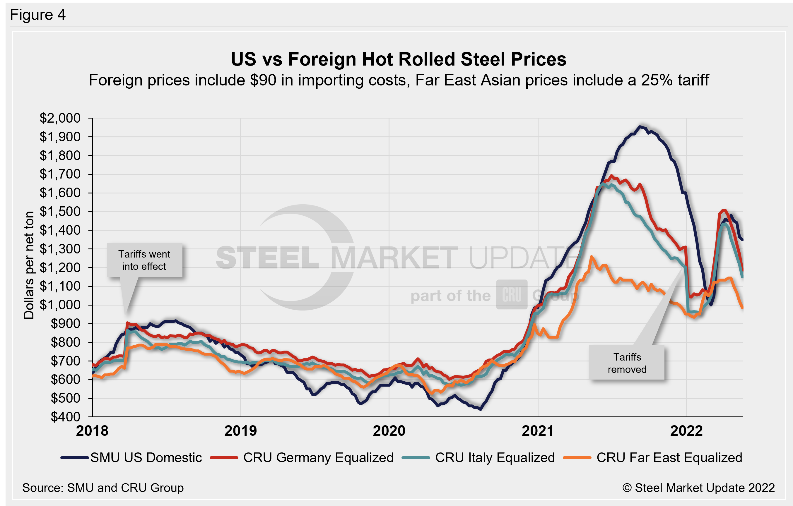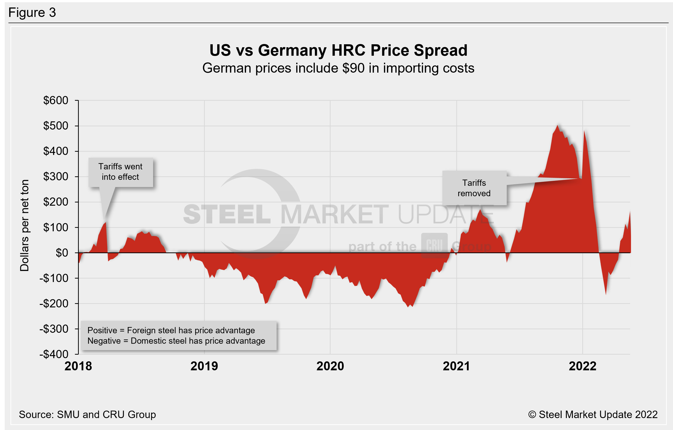 The latest CRU German HRC price is $1,096 per net ton ($1,208 per metric ton), down $87 per ton from last week and down $247 per ton from one month ago. After adding import costs, the delivered price of German HRC is approximately $1,186 per ton. Accordingly, domestic HRC is theoretically $164 per ton more expensive than imported German HRC, up from a spread of $92 the week prior and $47 one month ago. Recall that German prices were more expensive than domestic steel between late February and mid April. This is the highest spread seen since early February, and the fifth consecutive week foreign steel prices have held this price advantage. Prior to removal of the 25% tariff, the October 2021 spread of $504 per ton was the largest seen in SMU’s data history.