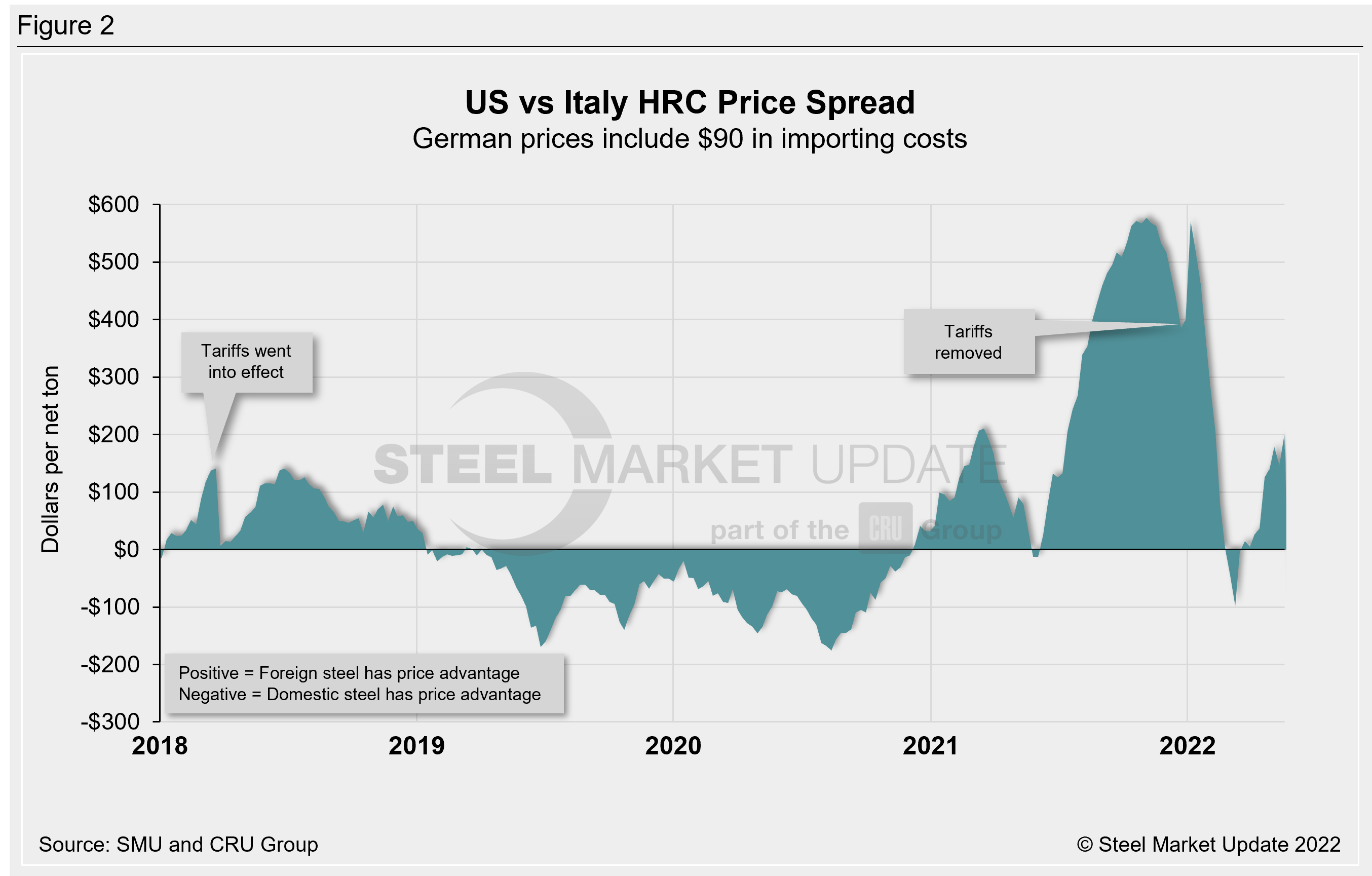 Note that effective Jan. 1, 2022, the traditional Section 232 tariff no longer applies to most imports from the European Union. It has been replaced by a tariff rate quota (TRQ). Therefore, the German and Italian price comparisons in this analysis no longer include a 25% tariff. SMU still includes the 25% S232 tariff on foreign prices from other countries. We do not include any antidumping (AD) or countervailing duties (CVD) in this analysis.