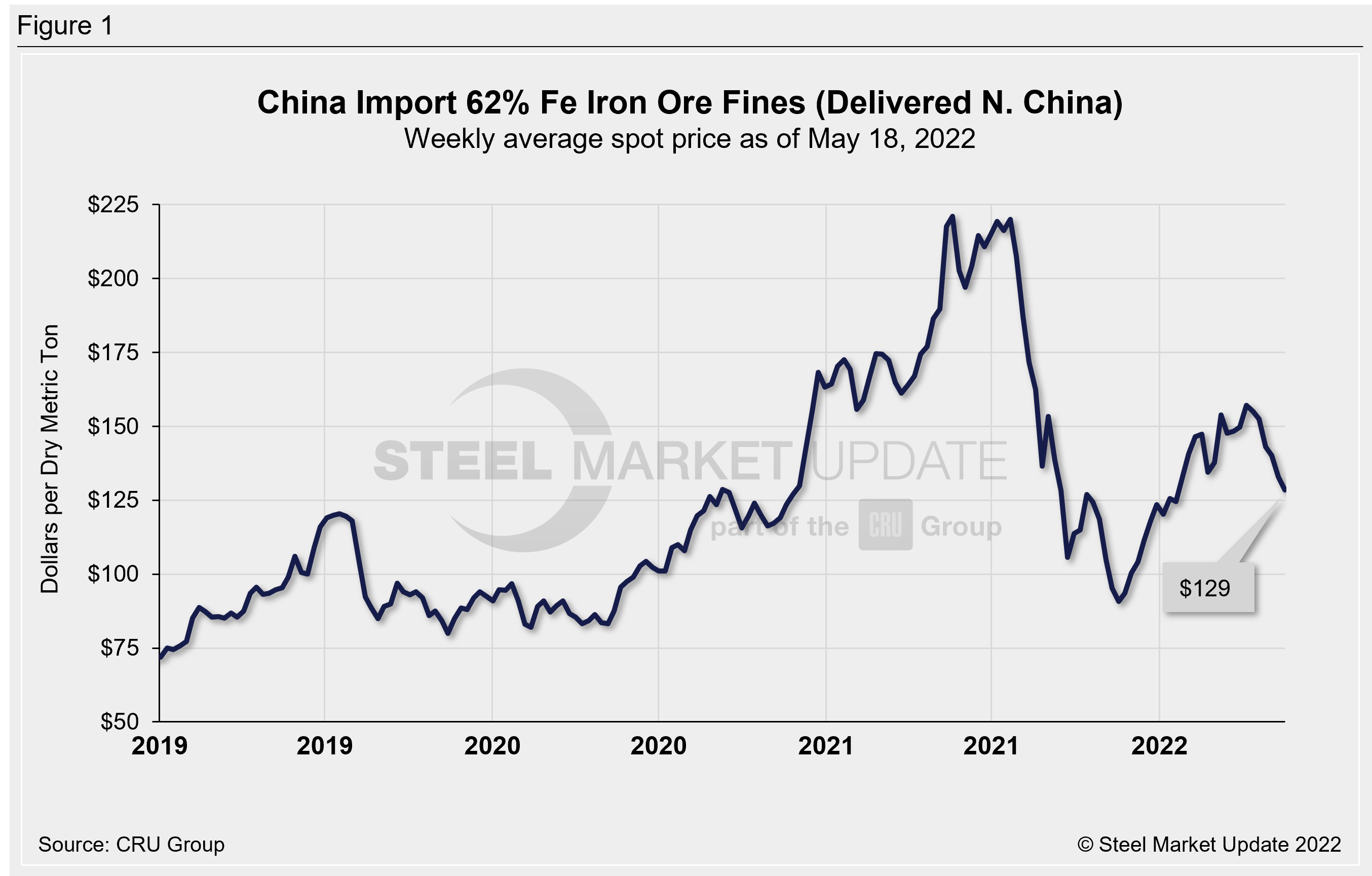 After rising to record levels last summer, the Chinese import price of 62% Fe content iron ore fines declined through November to reach an 18-month low. Prices then increased through April but have since began to decline. Figure 1 shows the price of 62% Fe delivered North China at $129 per dry metric ton as of May 18, levels last seen in January. Iron ore prices have decreased 16% in the last 30 days, down 13% compared to three months prior, and down 42% from the price this time last year.
