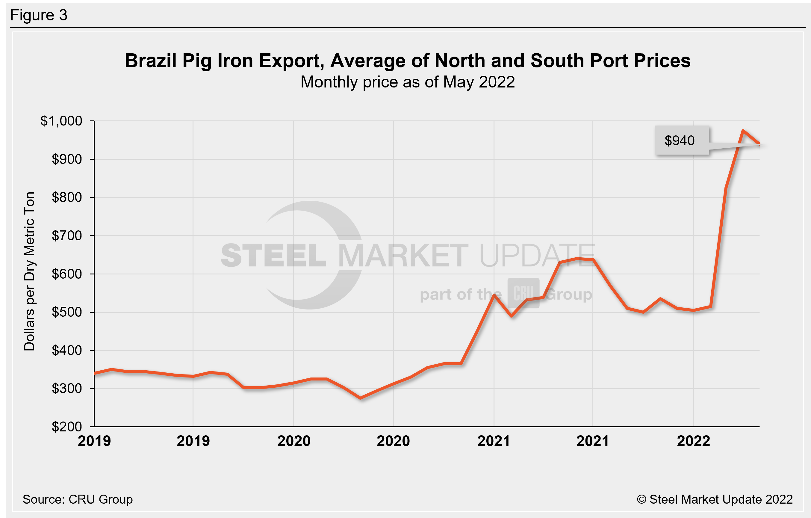 Most of the pig iron imported to the US had come from Russia, Ukraine and Brazil. This report summarizes prices out of Brazil and averages the FOB value from the north and south ports. Pig iron prices had been elevated but relatively stable for most of 2021 and early 2022. Prices jumped 60% in March following the invasion of Ukraine by Russian forces – which limited or halted supplies from both nations. The average pig iron price for May is now $940 per metric ton, down 4% from last month’s record high of $975 per ton. Recall that pig iron prices had reached a multi-year low of $275 per metric ton in May 2020 (Figure 3).