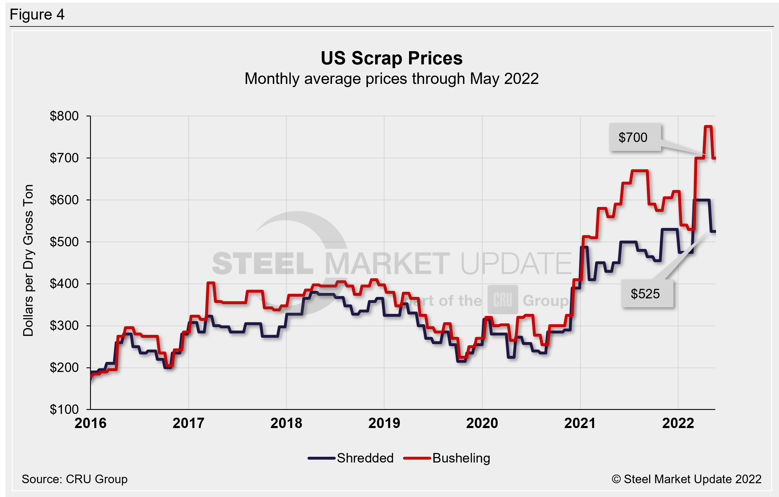 Scrap prices declined $75 per ton in May but remained historically high; busheling scrap prices fell to $700 per gross ton and shredded scrap prices declined to $575 per ton. Recall that April saw record-high scrap prices, with busheling reaching $775 per ton and shred $600 per ton. Prior to 2021, the previous record for scrap prices over the last decade was $510 per ton for busheling in December 2011 and $473 per ton for shredded in March 2012. Our scrap sources expect prices to ease $30-50 per ton in June.