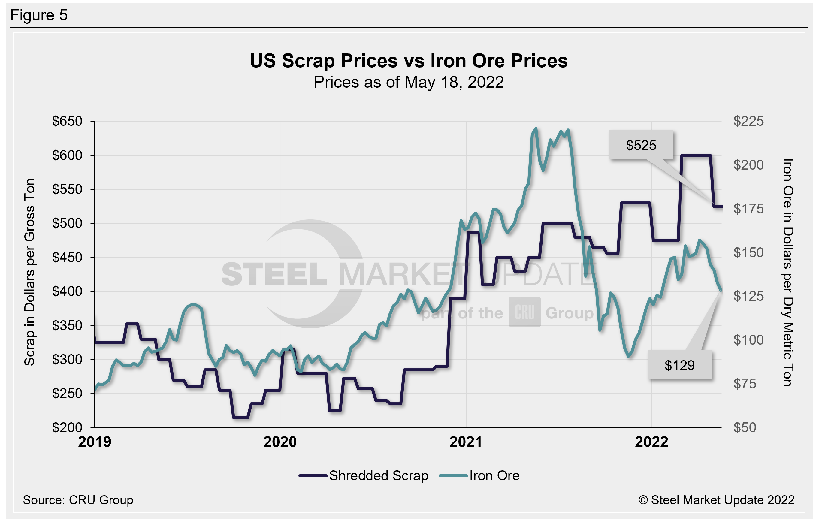 Figure 5 shows the prices of mill raw materials over the past four years. Iron ore prices are 42% below the May 2021 peak of $221 per dry metric ton, while shredded scrap prices are up 17% year over year.