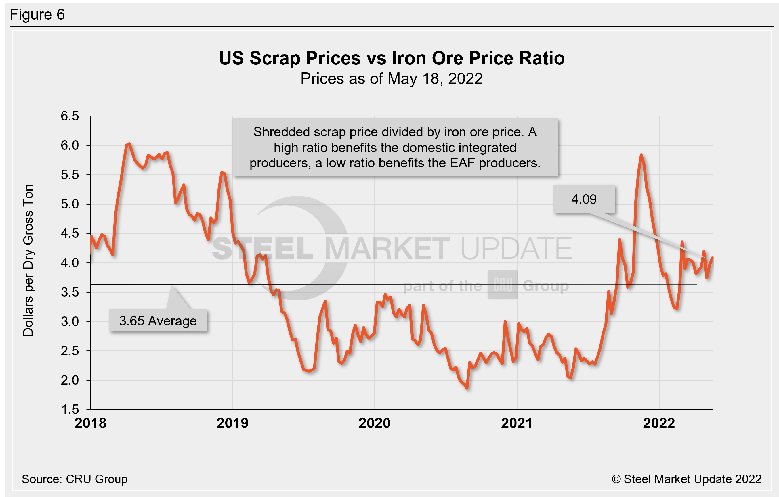 To compare the two, Steel Market Update divides the shredded scrap price by the iron ore price to calculate a ratio (Figure 6). A high ratio favors the integrated/BF producers, a lower ratio favors the minimill/EAF producers. At the current 4.09 ratio shown below, integrated producers currently hold the cost advantage and have since early March. Six months ago we saw a ratio of 5.84, the highest seen since mid-2018. The scrap to iron ore ratio reached a record low of 1.86 in August 2020 (within SMU’s 12-year data history).