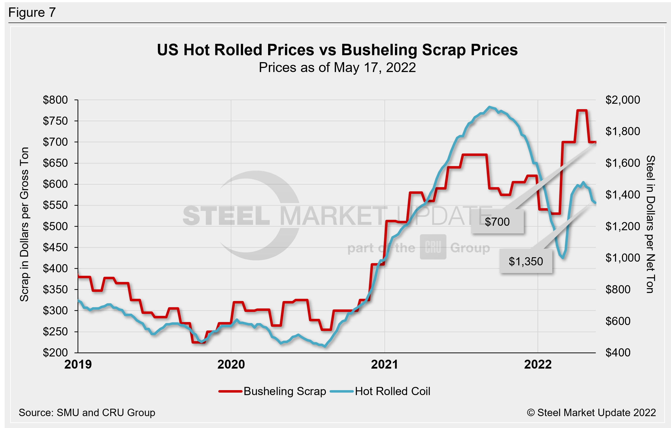 Figure 7 shows how the price of hot rolled steel generally tracks with the price of busheling scrap. Bush fell $75 per gross ton from April to May, back in line with March levels and up $110 per ton from one year ago. As of last week, the SMU hot rolled price average decreased $15 per ton week over week to $1,350 per ton. This is a decrease of $130 per ton compared to one month prior, nearing prices seen in mid-March, and down $220 per ton from this time last year.