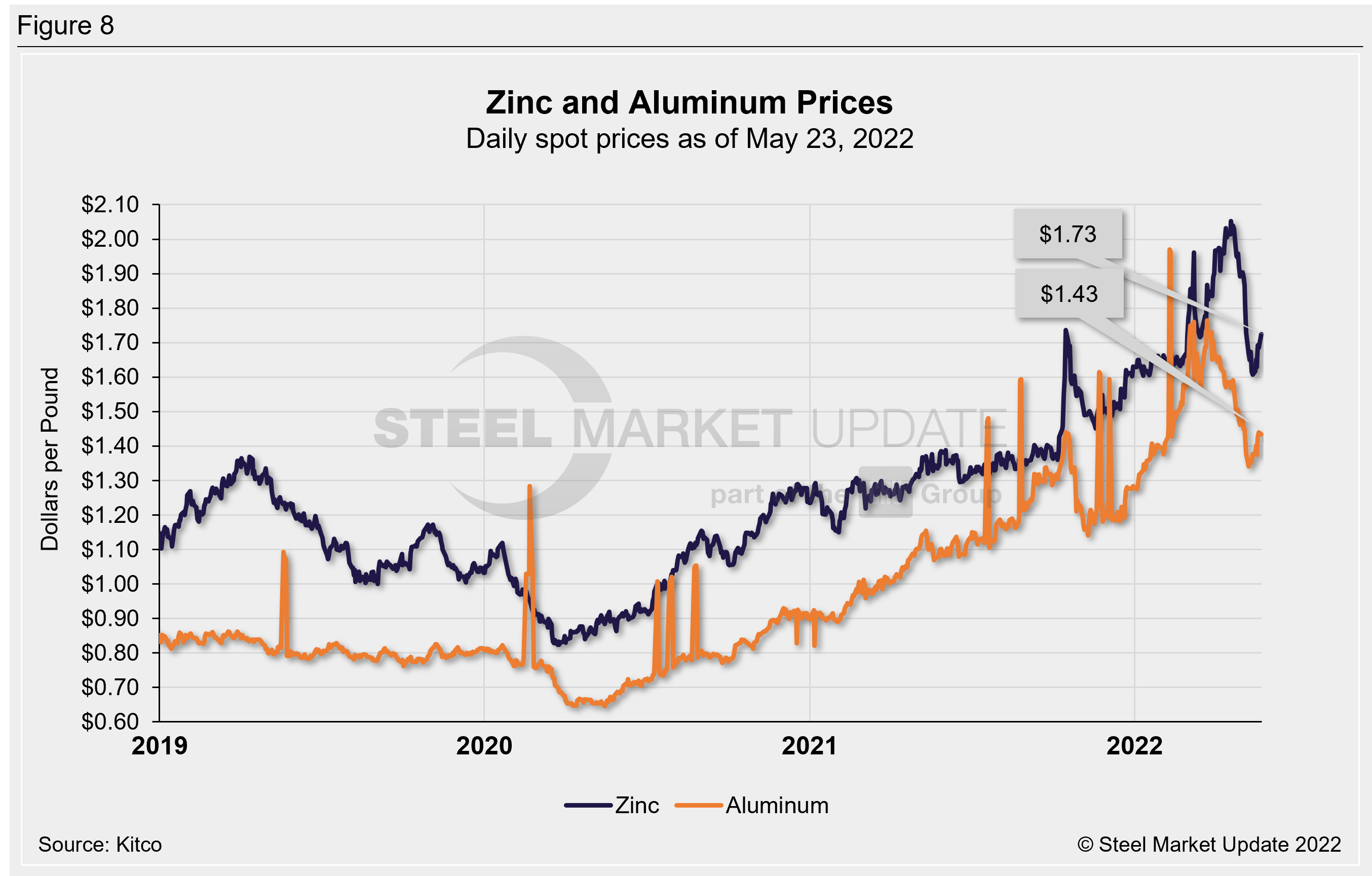 Zinc, used to make galvanized and other products, had rapidly increased in price in March and April, causing many mills to adjust their galvanized coating extras higher. The LME cash price for zinc surpassed $2 per pound on April 13 and peaked at $2.04 per pound as of April 21. Zinc prices have since declined, with the May 13 price falling to a four-month low of $1.61 per pound. The latest price as of May 23 is up to $1.73 per pound, up 5% compared to three months prior and up 29% from levels one year ago (Figure 8).
