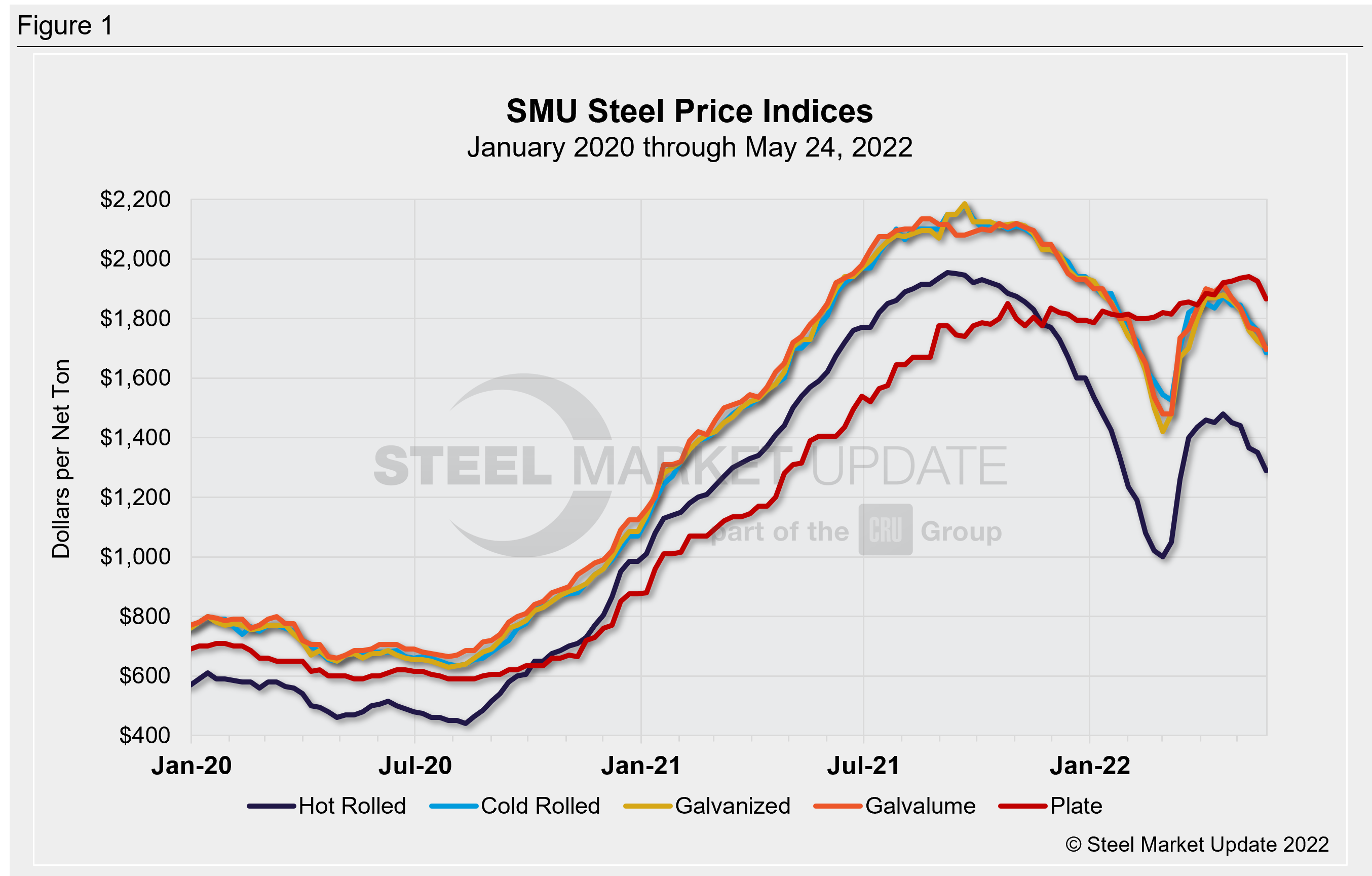 SMU Note: Below is a graphic showing our hot rolled, cold rolled, galvanized, Galvalume, and plate price history. This data is available here on our website with our interactive pricing tool. If you need help navigating the website or need to know your login information, contact us at info@SteelMarketUpdate.com.
