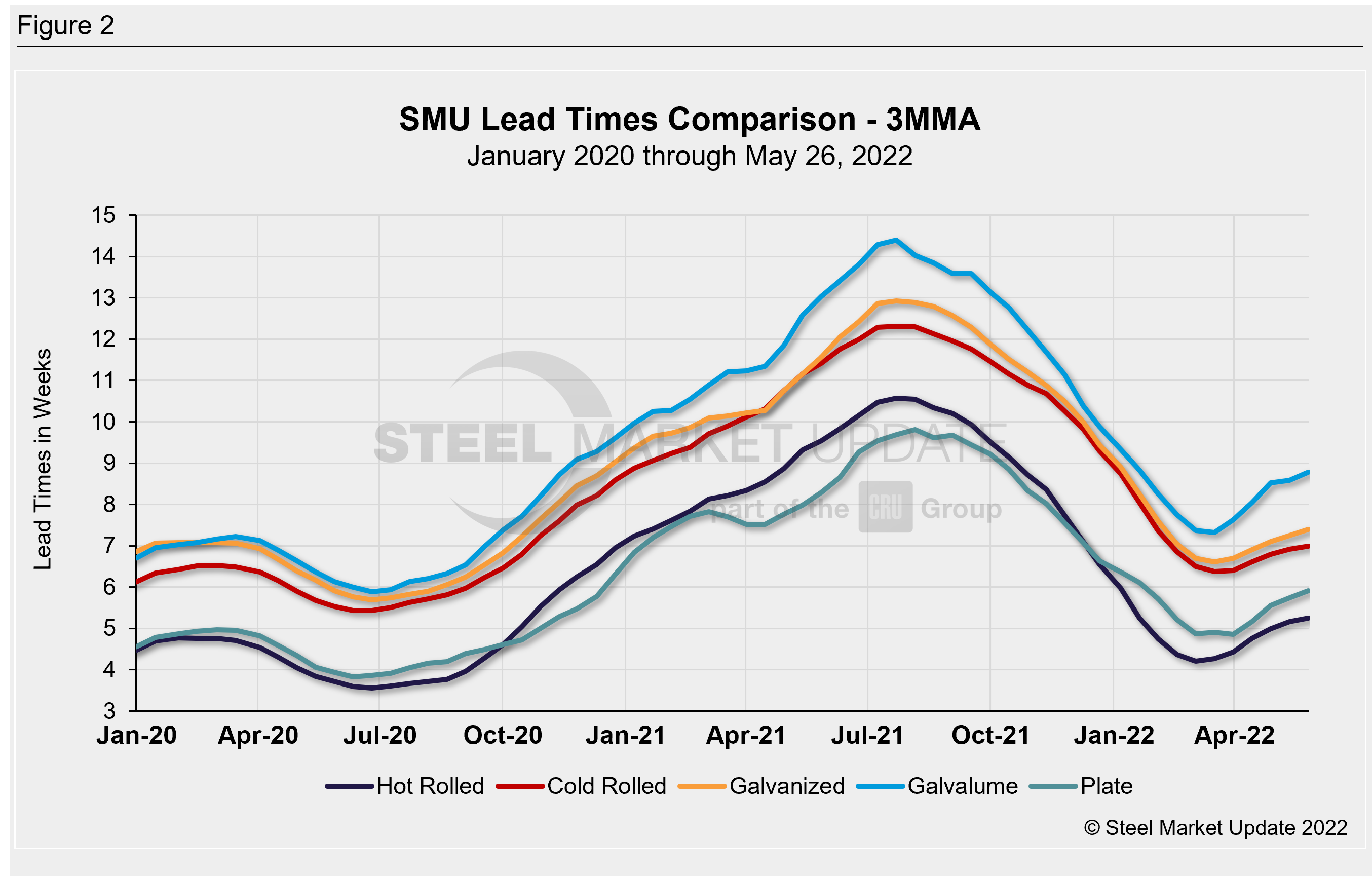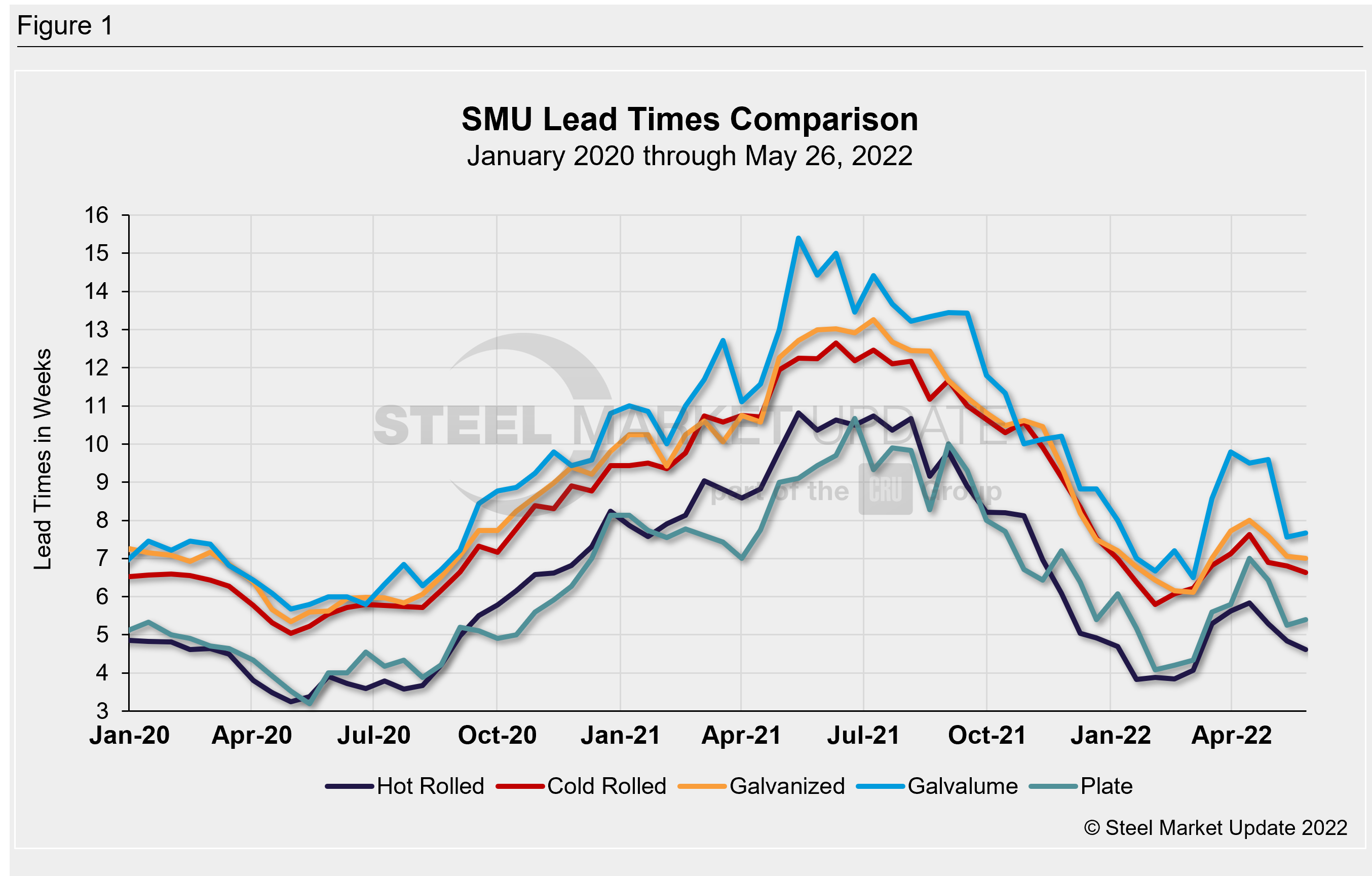 Buyers surveyed this week reported mill lead times ranging from 3–8 weeks for hot rolled, 5–10 weeks for cold rolled, 5–9 weeks for galvanized, 7–9 weeks for Galvalume, and 4–7 weeks for plate.