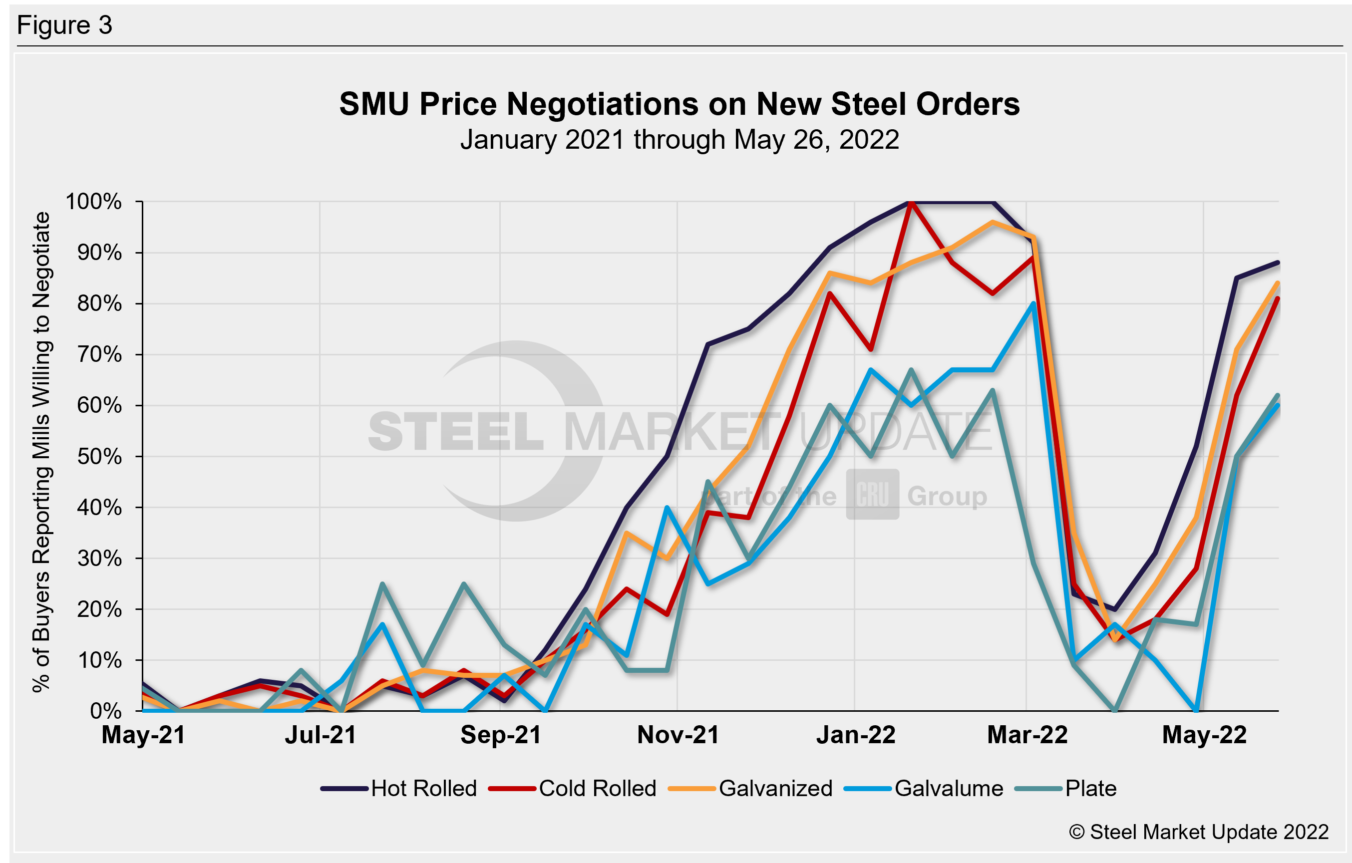 About 88% of hot rolled buyers surveyed this week responded that mills were willing to negotiate lower prices, up from 52% one month ago. Cold rolled and galvanized respondents tell the same story, with 81–84% of buyers reporting that mills are now negotiable, up from 28–38% in late April. Negotiations on Galvalume products are still mixed, with 60% reporting that mills are willing to negotiate, up from 50% two week prior. Negotiations were never quite as loose in the plate market, but our latest survey shows that 62% of plate buyers reported mills willing to bargain. This is up from 50% two weeks ago and up from just 17% one month prior.