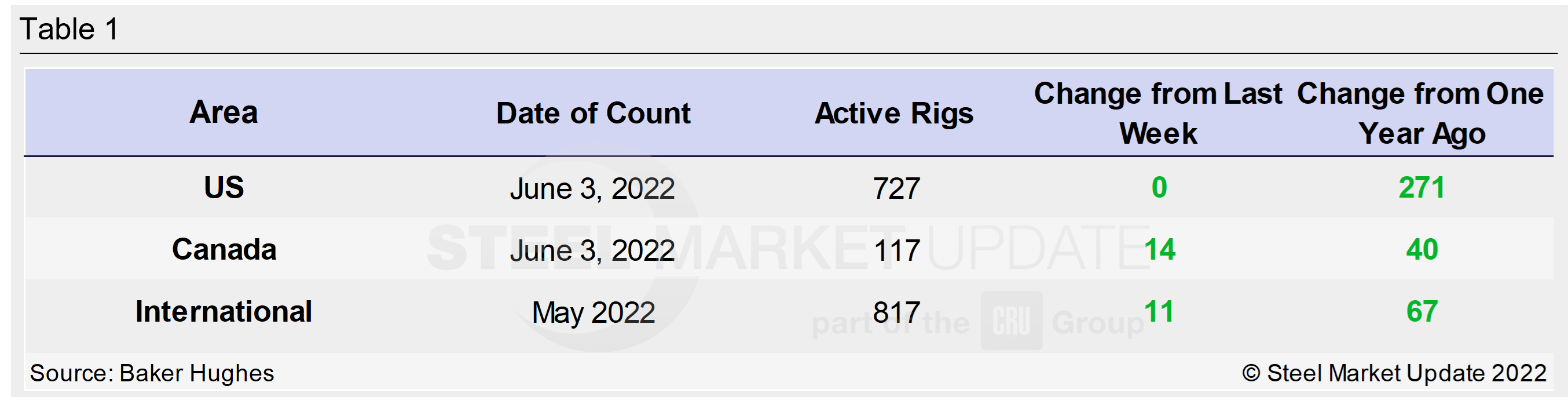 International rigs increased by 11 to 817 rigs for the month of May and are up 67 rigs from the same month one year ago. For a history of both the US and Canadian rig count, visit the Rig Count page on the Steel Market Update website here.