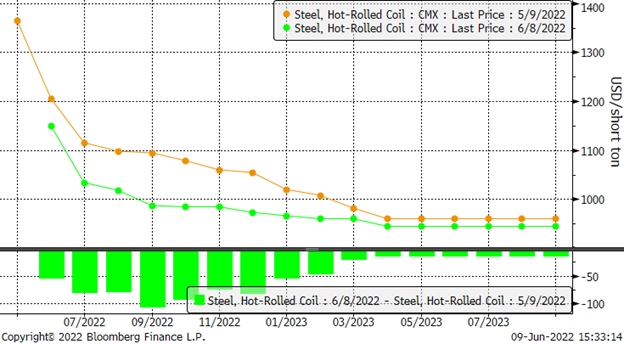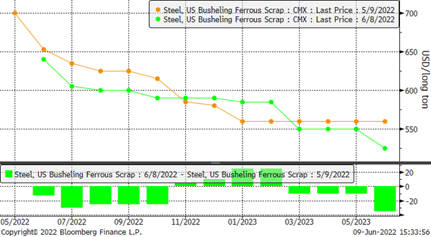 Scrap prices continue to retreat from their post-war highs, and we’ve heard some suggest scrap prices may flatten in July. The above forward curve has moved lower month on month through early Q4 ’22, with slightly higher scrap prices expected in the Nov22-Feb23 timeframe. HMS prices are now $20 per gross ton lower than they were in November 2021, yet busheling prices are $130/gt higher than that same period. Much has been written about the elevated spreads between grades of scrap and the new EAF mills’ appetite for scrap. This month, we have begun to see those spreads narrow from the $245/gt peak in April/May to $220/gt in June. Given the mix shift of EAF mills to try and blend more lower grade scrap into their melt, it seems plausible that HMS grades may have found a floor but busheling scrap may still have some room to the downside to get those spreads back in historical ranges – although iron ore remained mostly stable throughout China’s Covid lockdowns. Most look to the busheling prices as a clue to the cost impact for flat rolled suppliers and thus sheet pricing, so we will continue to keep a close eye on the scrap side and on these spreads.