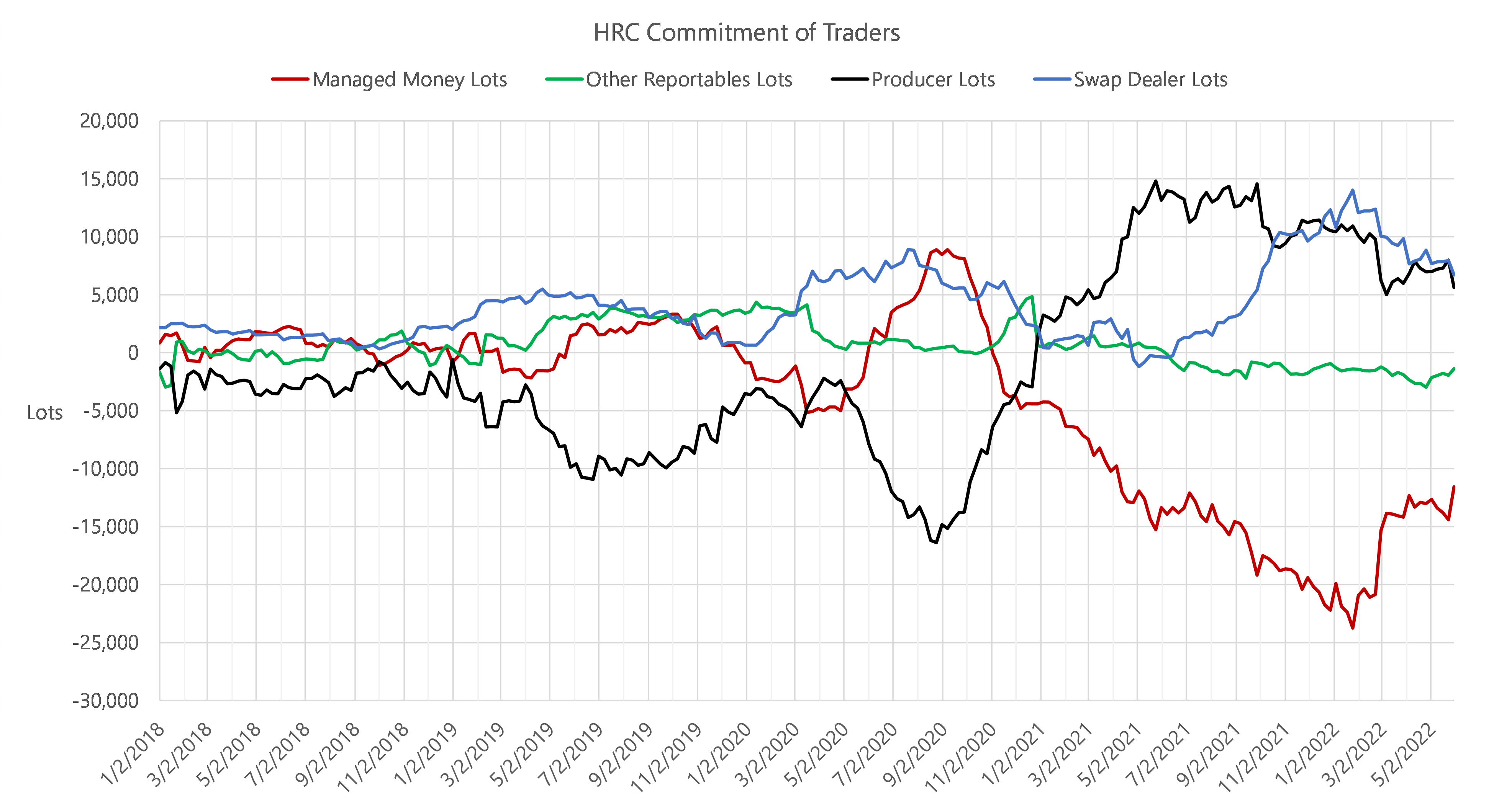 The chart above shows how managed money (red line) has been reducing their HRC short positions, although most of the short covering occurred as the war in Ukraine sent prices spiking. Producers (black line) and swap dealers have also been gradually reducing their long positions. Each group remains modestly long or short, so one must wonder if we are approaching a period where we’re waiting to see whether either side blinks. Either managed money starts taking profits, or producers/swap dealers scramble to get into short position to protect against further downside pricing moves and changes the momentum of the forward curve.