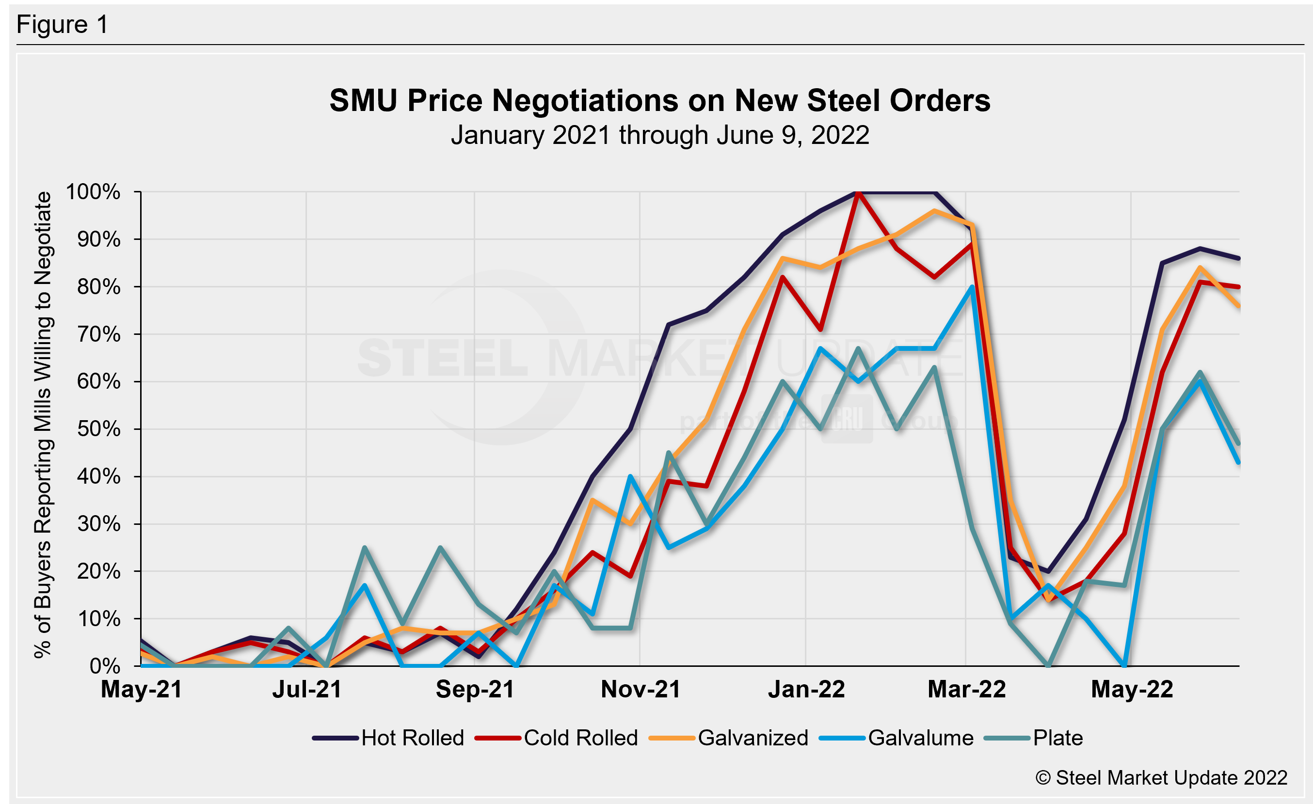 All told, 86% of hot rolled buyers surveyed this week responded that mills were willing to negotiate lower prices, in line with levels seen since mid-May. Cold rolled and galvanized respondents tell the same story, with 76-80% of buyers reporting that mills are now negotiable. This is slightly lower than rates two weeks ago but up from 62-71% one month prior. Negotiations on Galvalume products are mixed, with 43% reporting that mills are willing to negotiate, down from 60% two weeks prior and down from 50% one month ago. But Galvalume figures can be more volatile due to the limited size of that market and our smaller sample size.
