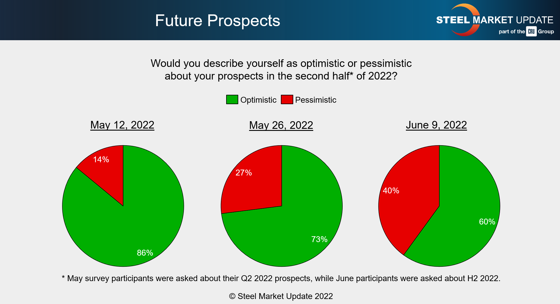 We asked those responding to our survey last week whether they were optimistic or pessimistic about their prospects in the second half of 2022. What we are finding is that a fairly significant amount of pessimism is taking hold. In mid-May, only 14% of respondents reported being more pessimistic. By late May, that number had almost doubled to 27%. This past week, the percentage of respondents reporting being more pessimistic expanded to 40%.
