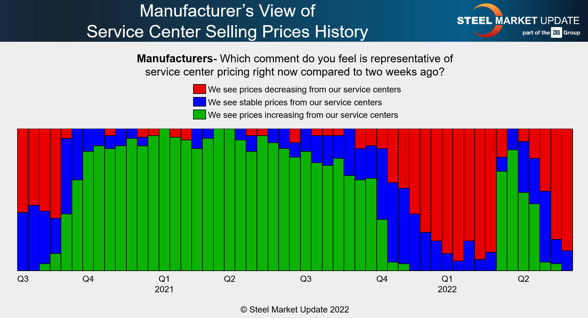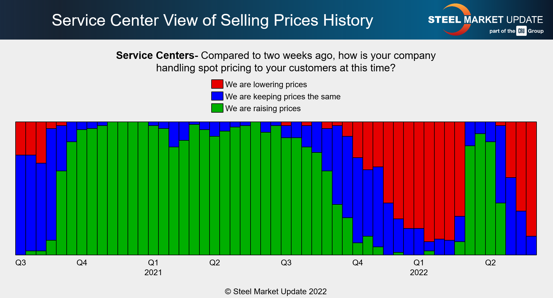 Service centers are in agreement with the manufacturing community: 86% of service centers reported that their companies were lowering spot prices. That compares to 42% a month ago and 67% two weeks back.