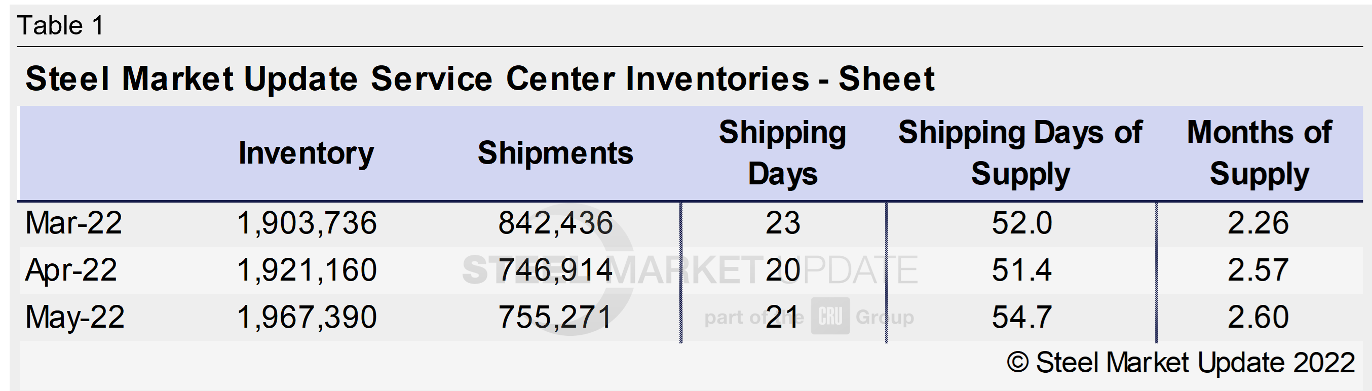 US service center flat rolled inventories rose in May as many service centers reported signs of slowing demand. At the end of May, service centers carried 54.7 shipping days of supply on an adjusted basis, according to SMU data. This was up from 51.4 shipping days in April. In terms of months of supply, service centers had 2.6 months of supply in May, which was consistent with 2.57 months in April.