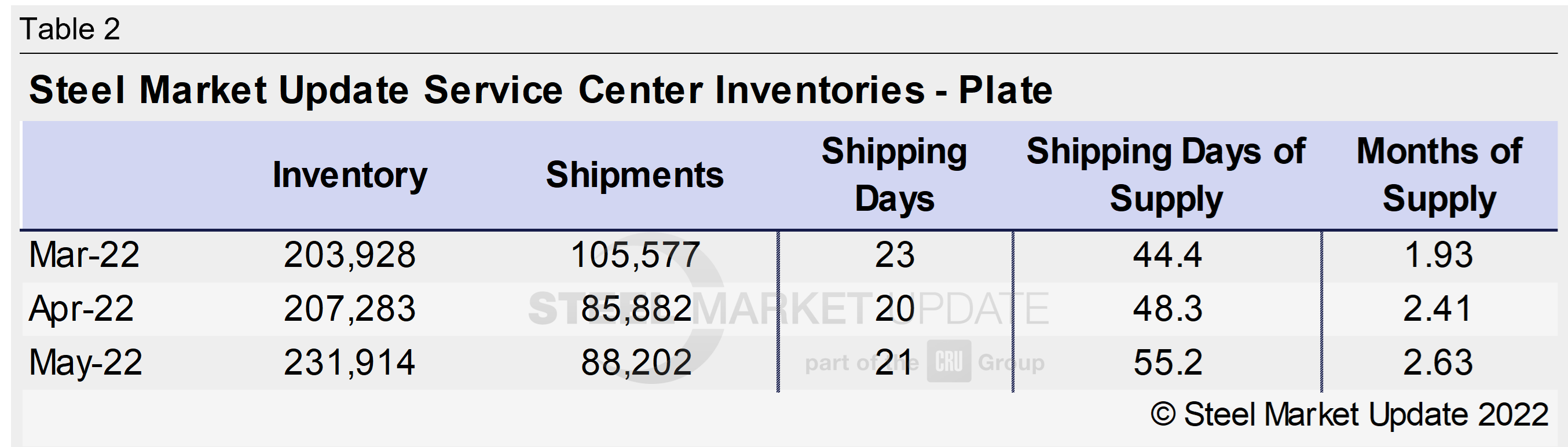 US service center plate inventories increased again in May, after reaching a low point in March. At the end of May, service centers carried 55.2 shipping days of plate supply, according to SMU data. This is up from 48.3 shipping days in April. Plate inventories represented 2.63 months of supply in May, up from 2.41 months in April.