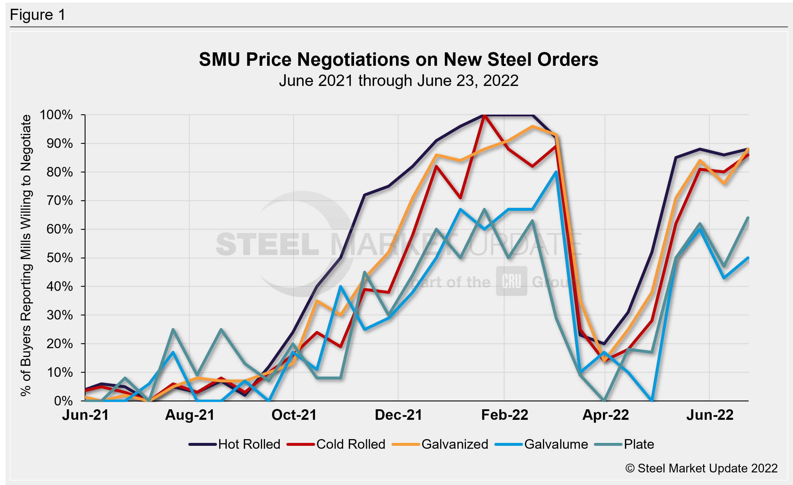 Broken down by product, 88% of hot rolled buyers surveyed this week responded that mills were willing to negotiate lower prices, in line with the levels we’ve recorded since mid-May. Cold rolled and galvanized respondents have also told the same story since late May, with 86-88% of buyers now reporting that mills are now negotiable. Negotiations on Galvalume products are mixed, with 50% reporting that mills are willing to negotiate, up from 43% two weeks prior but down from 60% one month ago. Note that Galvalume figures can be more volatile due to the limited size of that market and our smaller sample size.