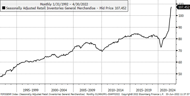 There have been some interesting articles written recently about the bullwhip effect, which is loosely defined as the distortion of demand and increasing volatility that occurs as forecasts and orders move through the supply chain. The thesis of many of these articles has been that inflation may be less of a headwind to the economy as you look at some of the economic data, though ramifications for the metals industry could be a bit more problematic. The chart below shows the seasonally adjusted growth in retail inventories of general merchandise for the last three decades. Many of these retailers are those that pride themselves on being supply chain experts (e.g., Wal-Mart, Target, etc.). This recent spike in inventories seems ominous to us.