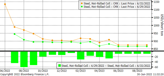 That brings us back to the volatility that lies ahead. The tone from mills and service centers continues to be mostly bearish. Even if demand is stable, a falling price environment always puts the industry in a bad mood. End users, on the others hand, seem to be signaling a slightly better outlook. However, when you look at the change in HRC futures over the last few weeks, the market has become only slightly more bearish in the near term with pricing grinding lower by $40-$60/t. Pricing levels are in the mid/high $800s per ton for most of 2022 and into 2023. Given all the negativity, it is a bit surprising that these further out levels have been supported.