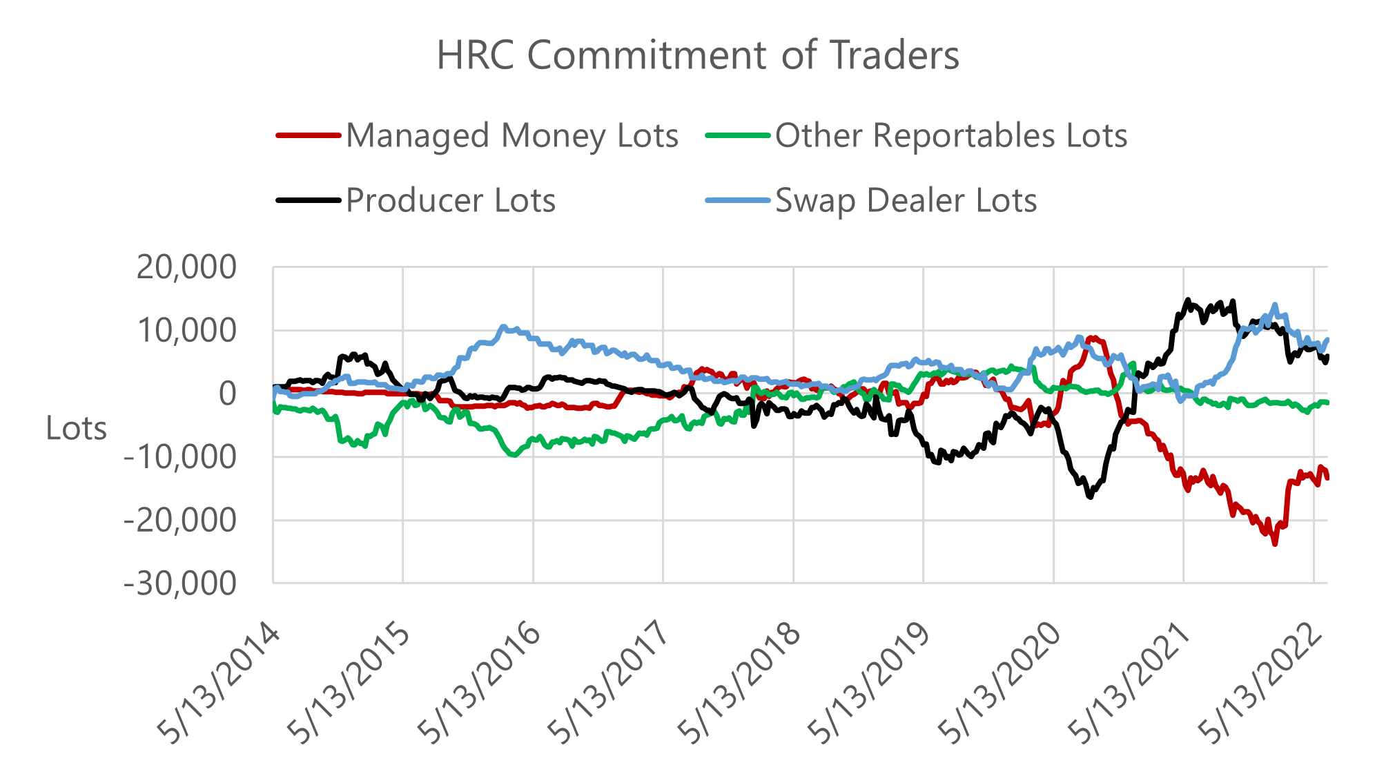Looking at activity among those trading futures via the commitment of traders report, you’ll see that managed money did some short covering in mid-Q1 but have been holding fairly stable at around 13,000 contracts short. Producers seem to be slowly decreasing their long positions. But neither of the two have been doing so with any real urgency as of late.