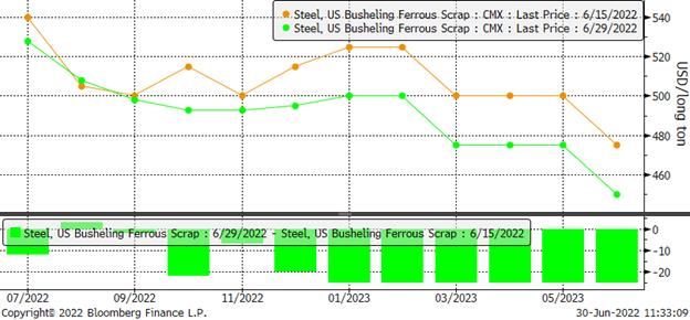 As for the outlook on the busheling scrap trade, things are less congruent with HRC futures. Those price expectations are suggesting little movement in scrap prices in the short term but further deterioration as we get into Q4 2022 and the first half 2023.