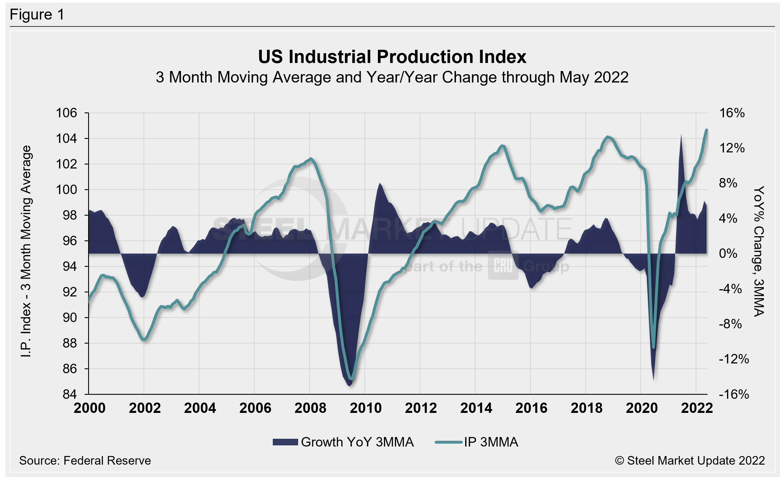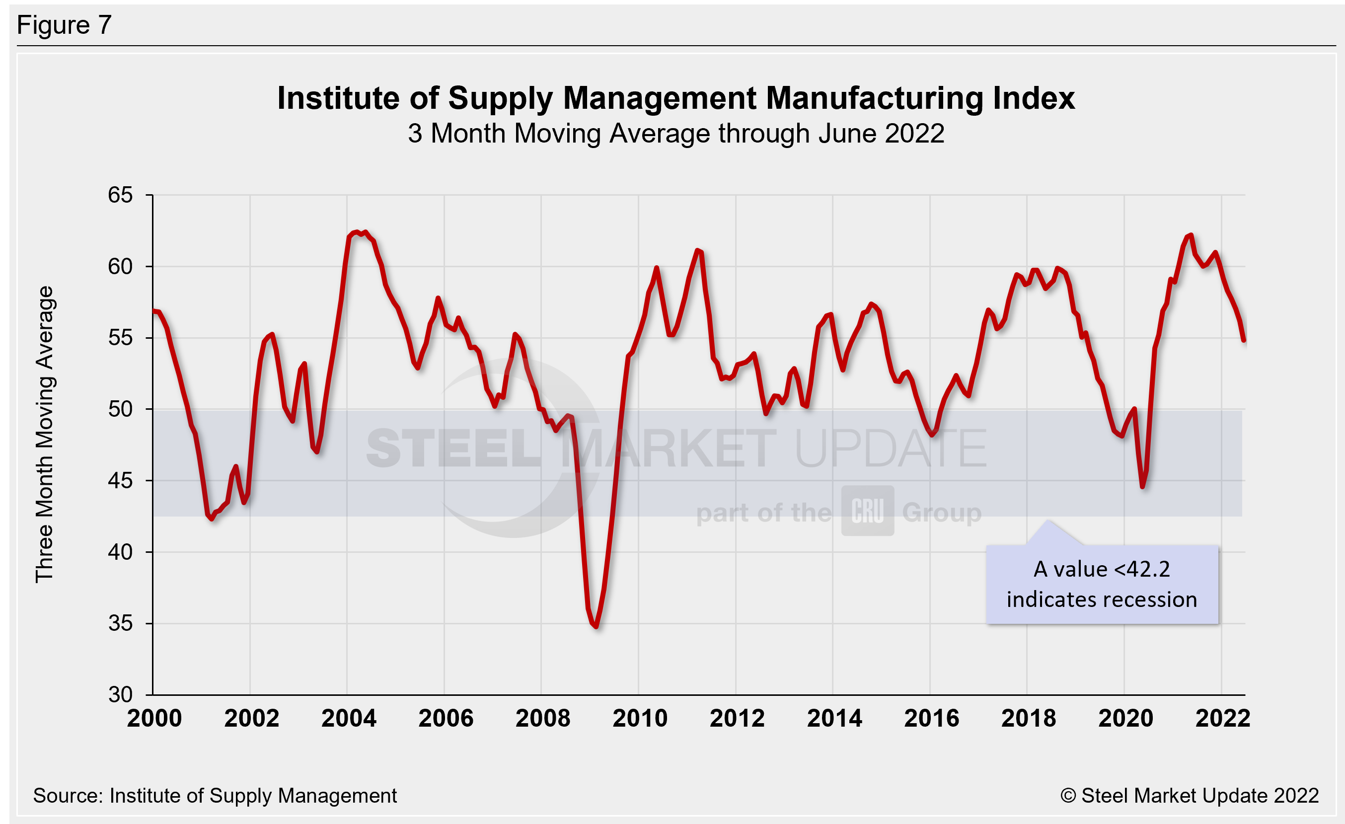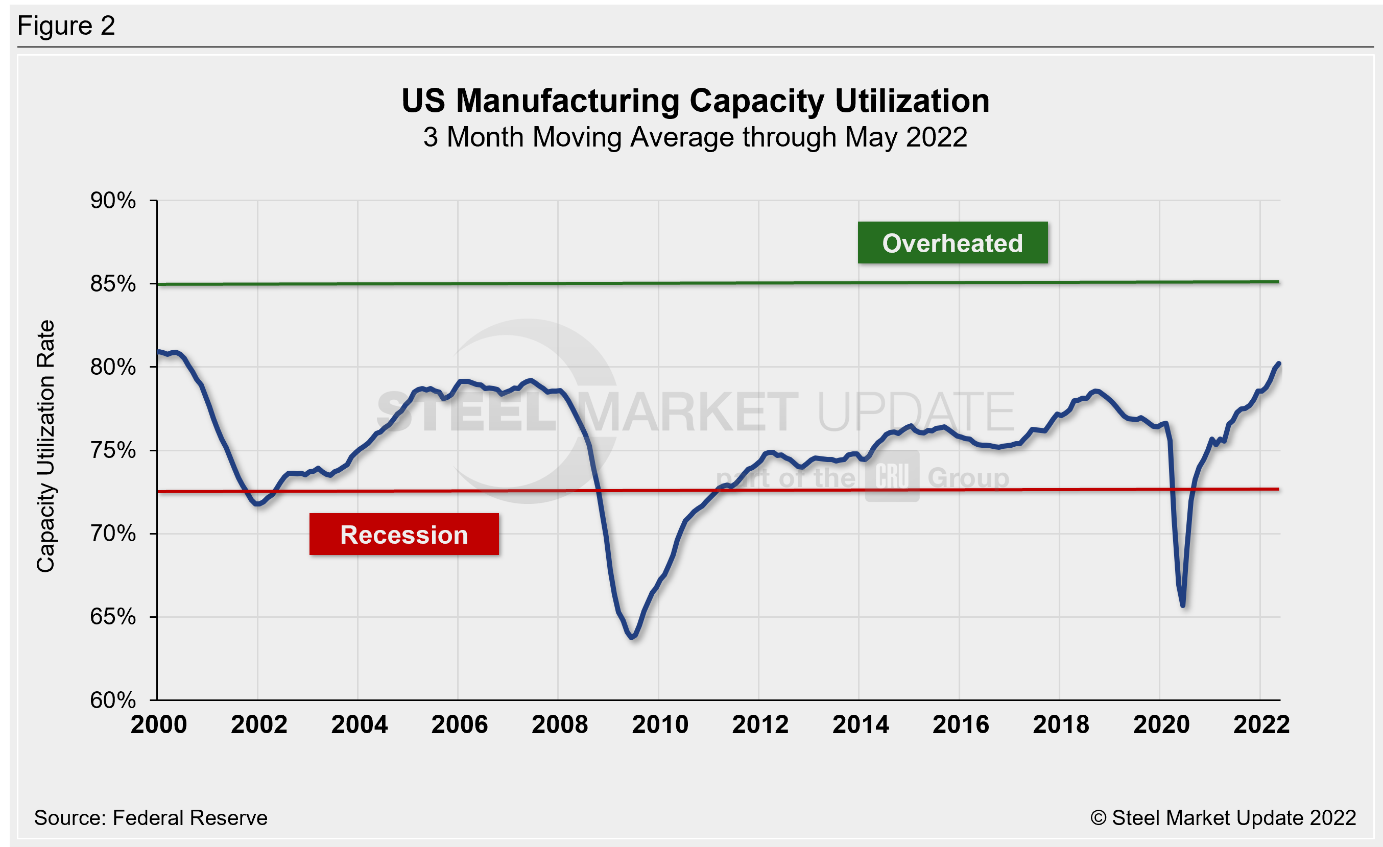 Data on US industrial production, capacity utilization, orders and inventories continued to improve through the first half of 2022, indicating a strengthening manufacturing sector. The health of the manufacturing economy has a direct bearing on the health of the steel industry.