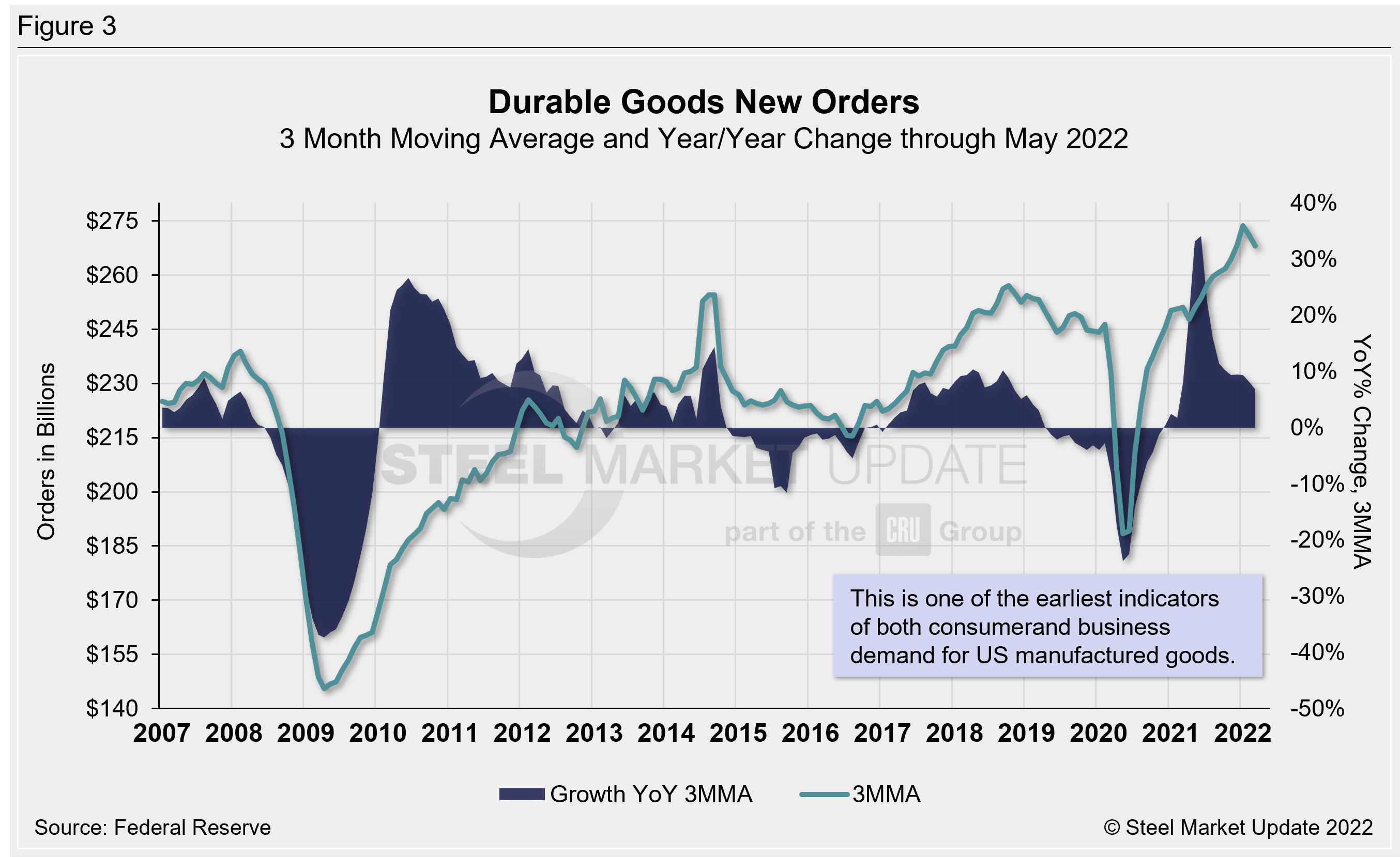 New orders for durable goods, an early indicator of consumer and business demand for US manufactured goods, continues to recover from the 2020 shock (Figure 3). New orders are at $265.6 billion as a 3MMA through May 2022, up 5.9% over the same period in 2021. Back in January of this year, we saw a 3MMA of $273.6 billion, the highest level in our history dating back to 1992. Recall the 3MMA had dropped by 23% from February through May 2020, reaching a 10-year low of $188.4 billion.