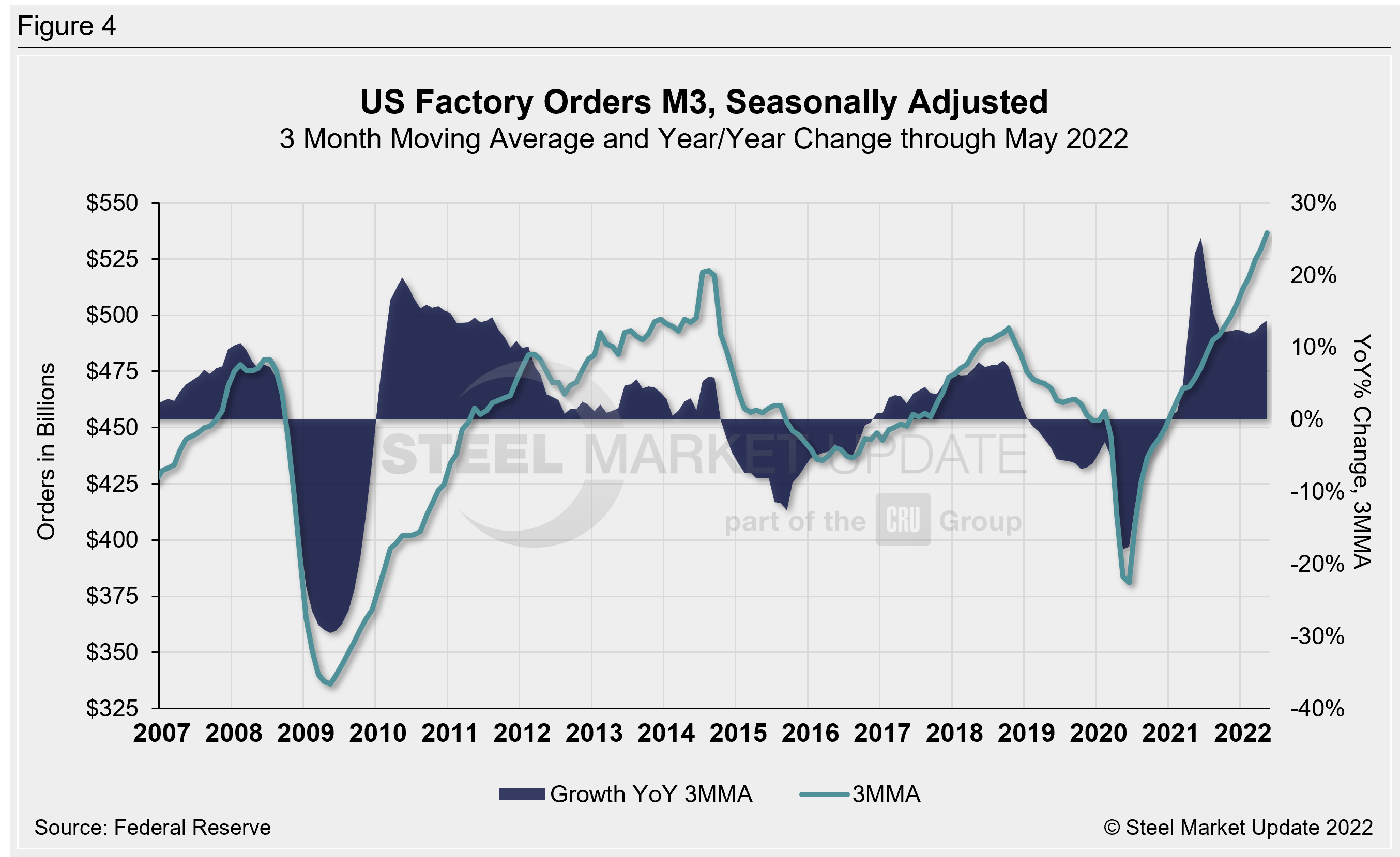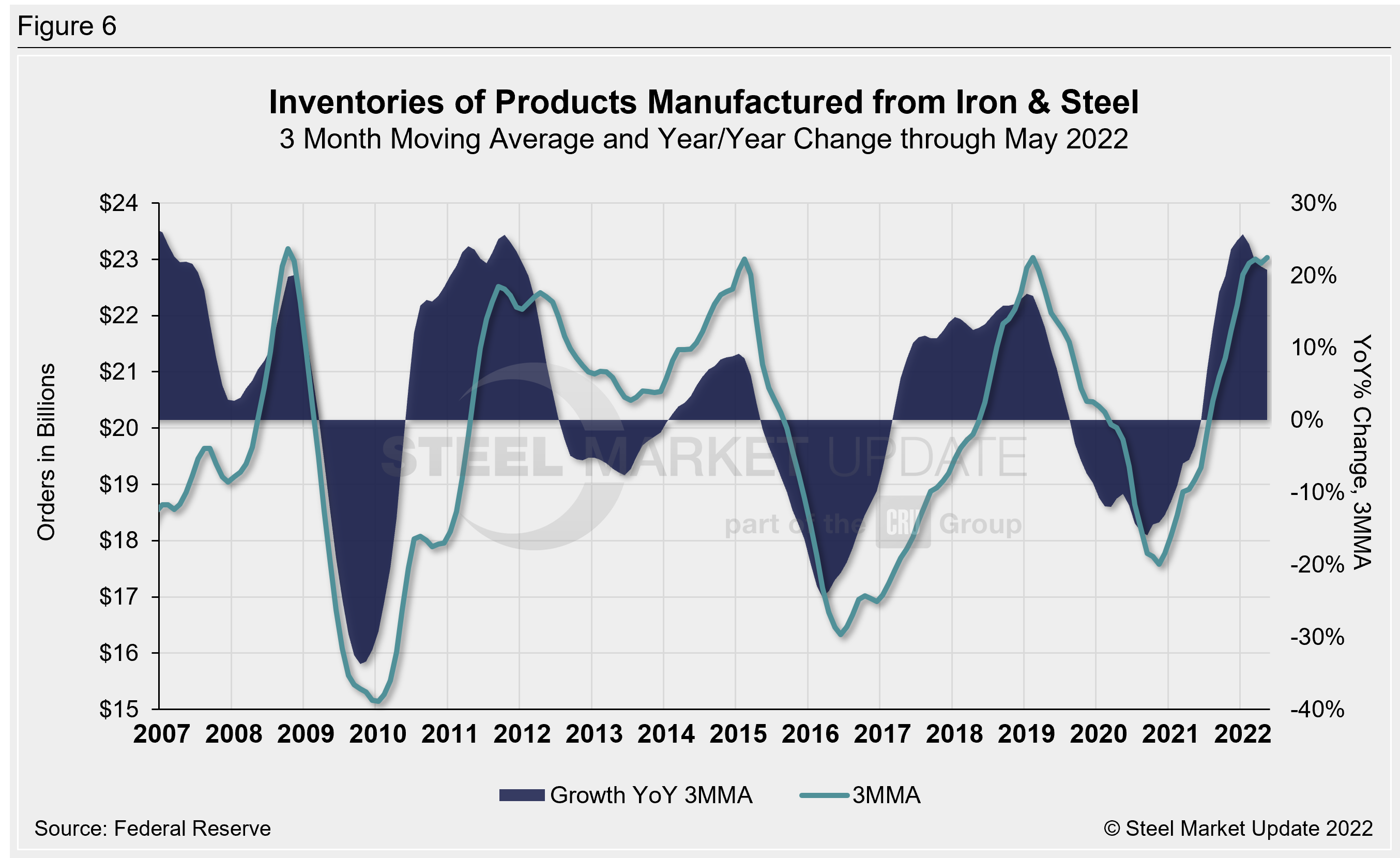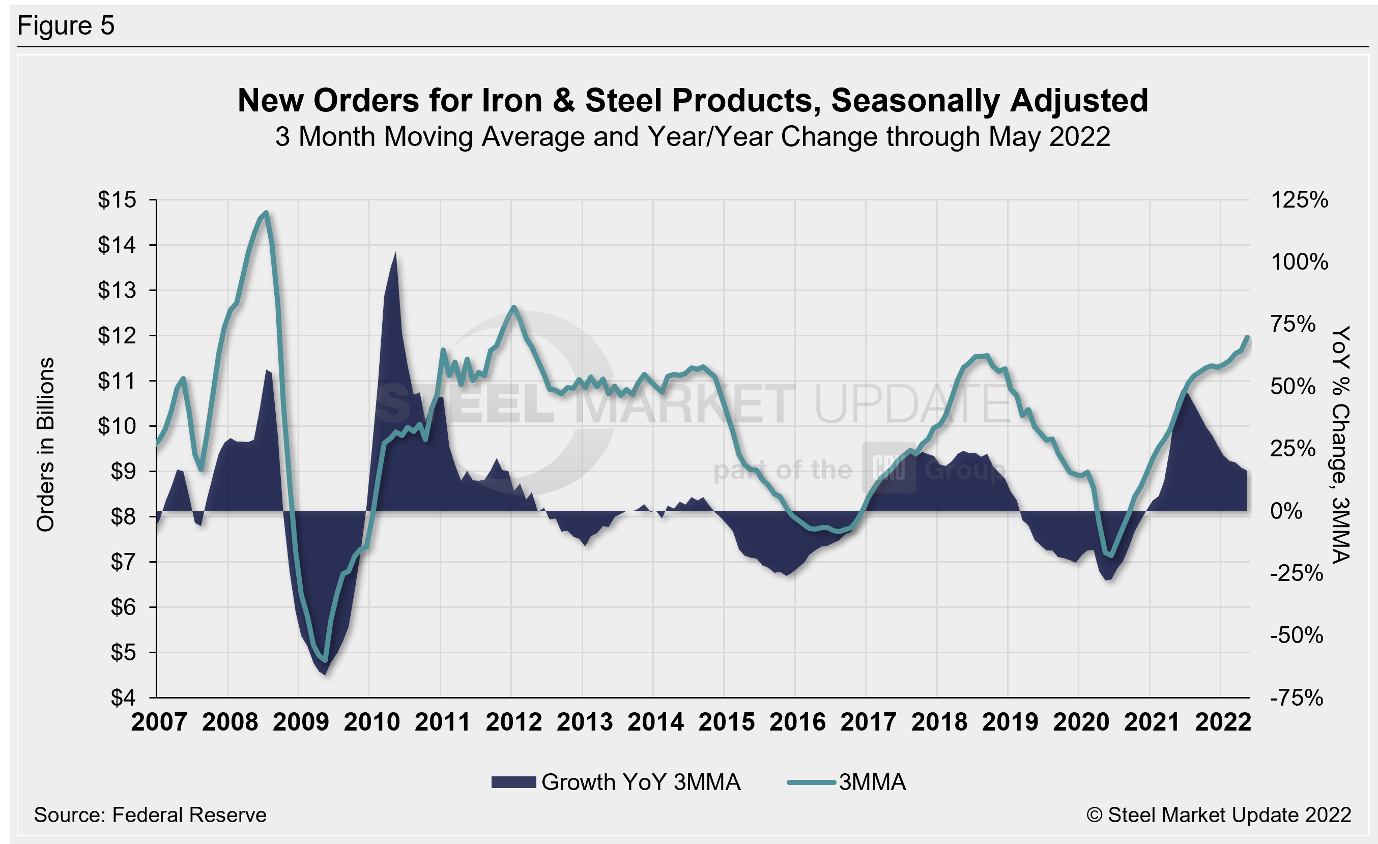 Within the Census Bureau M3 manufacturing survey is a subsection for iron and steel products. Figure 5 shows the history of new orders for iron and steel products since 2007 as a 3MMA. The 3MMA year-over-year growth rate, which reached negative 27.8% in May 2020, is now at positive 16.2% as of May. The 3MMA new order level is now at $12.3 billion, the highest seen since February 2012. Back in June 2021, the 3MMA year-over-year growth rate reached a multi-year high of 49.0%, the highest rate since July 2010.