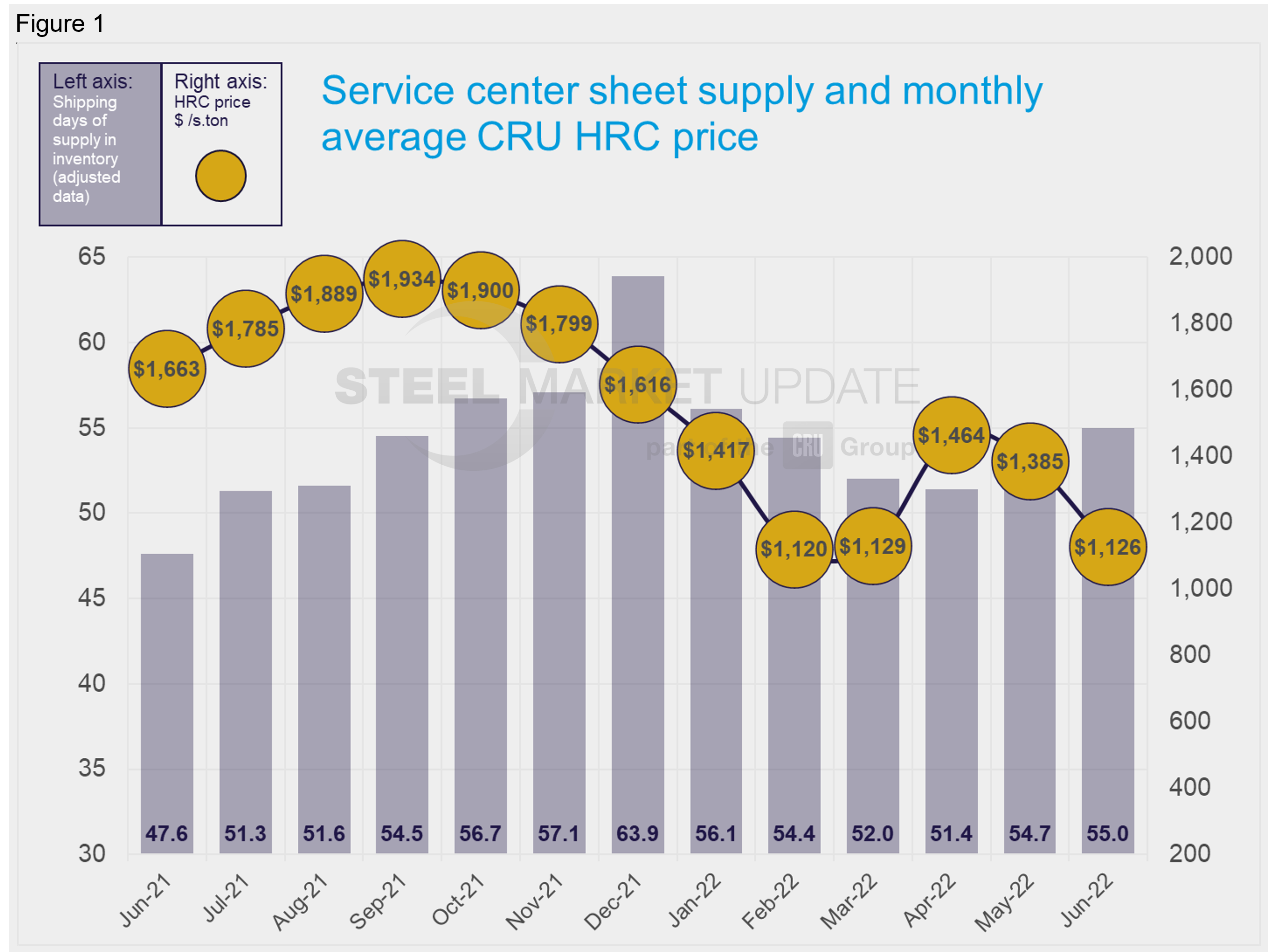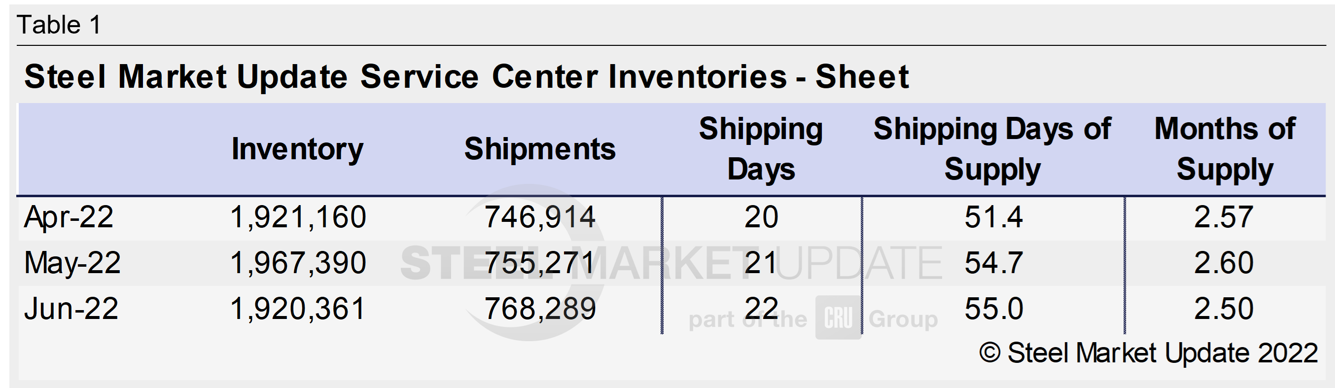 US service center flat rolled inventories edged up in June. At the end of June, service centers carried 55 shipping days of supply on an adjusted basis, according to SMU data. This was up from 54.7 shipping days of supply in May. In terms of months of supply, service centers had 2.5 months of supply on hand, down from 2.6 in May. June had 22 shipping days, one more than the 21 in May.